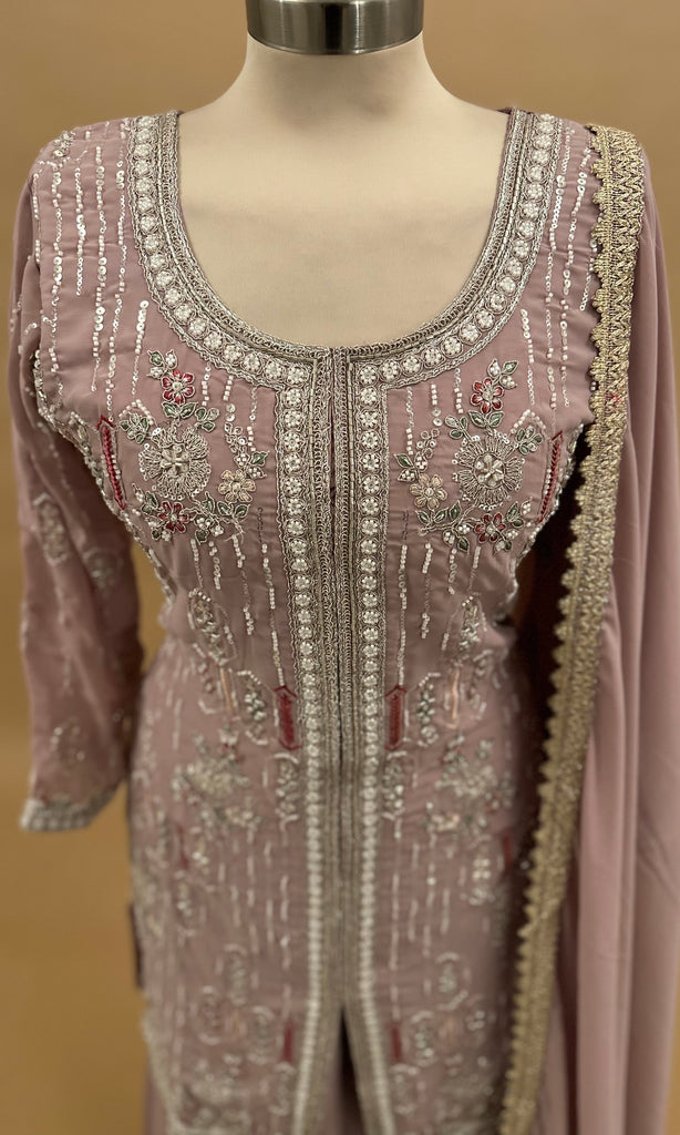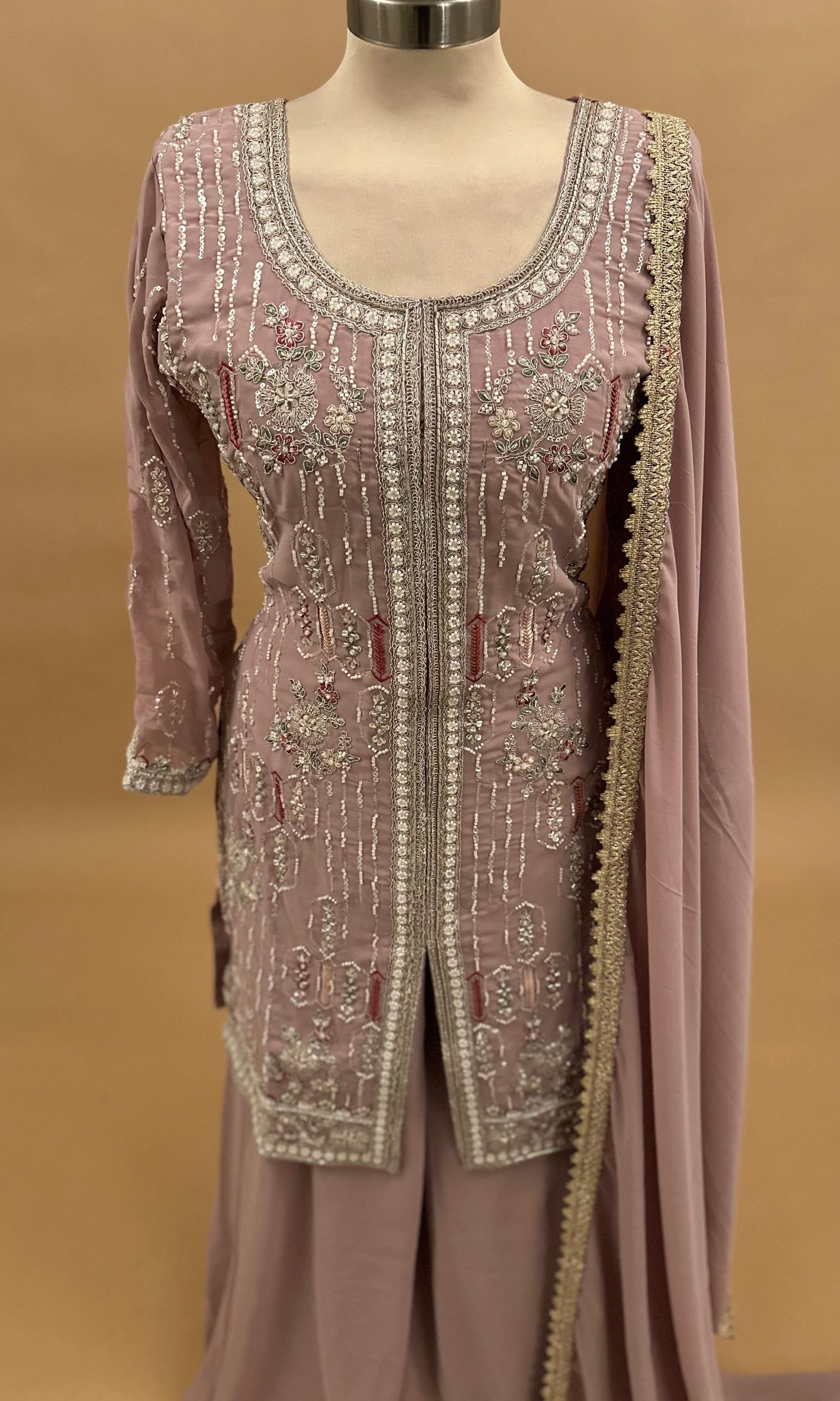 Experience elegance with this lightweight dusty purple palazzo suit, beautifully crafted from soft georgette fabric. The intricate beads embroidery enhances its sophisticated appeal, making it perfect for festive occasions or formal events. Complete with a matching dupatta, this ensemble balances comfort and style effortlessly.