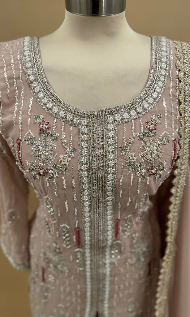 Experience elegance with this lightweight dusty pink color palazzo suit, beautifully crafted from soft georgette fabric. The intricate beads embroidery enhances its sophisticated appeal, making it perfect for festive occasions or formal events. Complete with a matching dupatta, this ensemble balances comfort and style effortlessly.