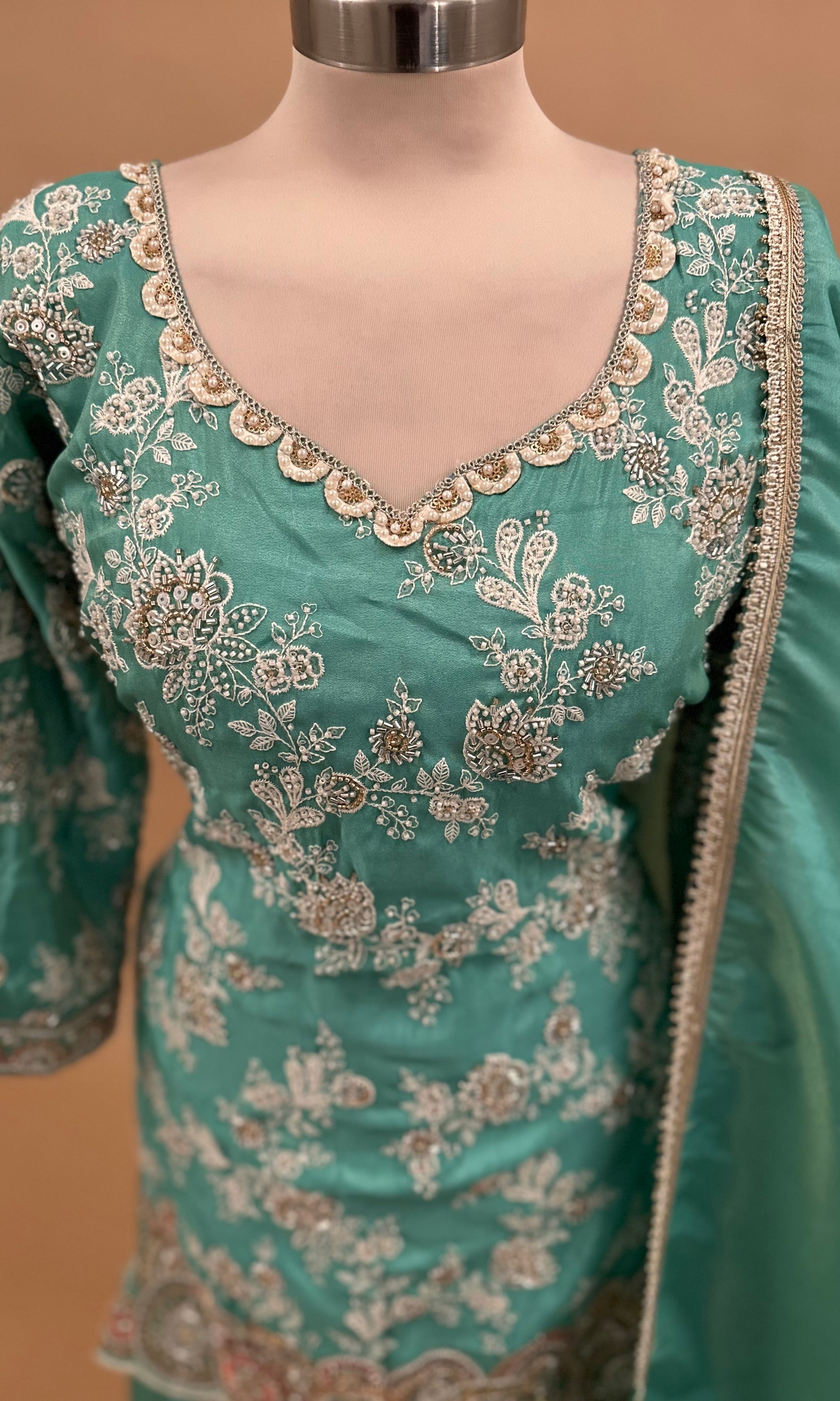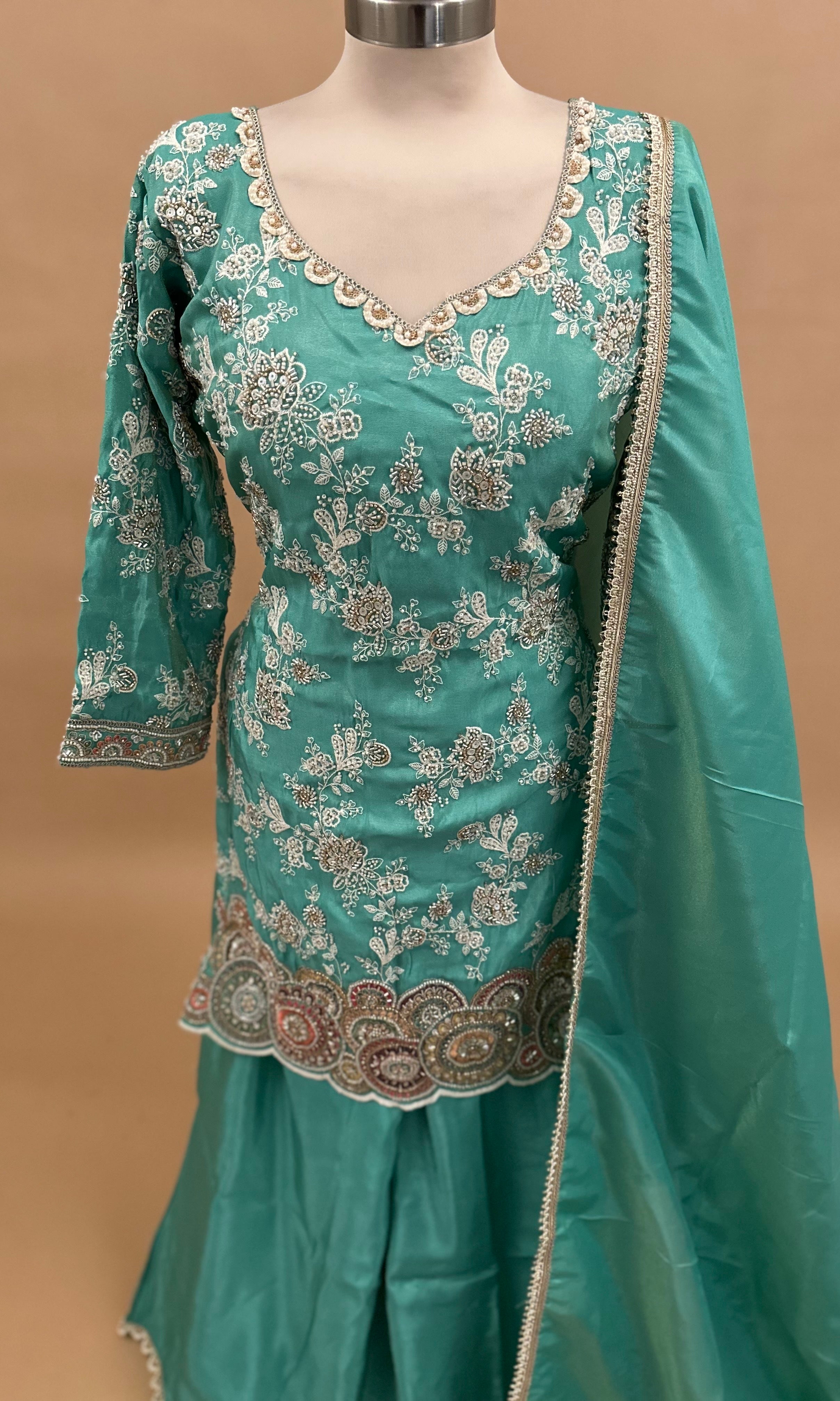 Elevate your festive wardrobe with this blue party wear palazzo suit crafted from shimmering fabric that catches the light gracefully. Embellished with intricate pearl and stone embroidery, it offers a sophisticated and elegant aesthetic. The coordinated dupatta completes the ensemble, making it perfect for special occasions where style and comfort merge seamlessly.