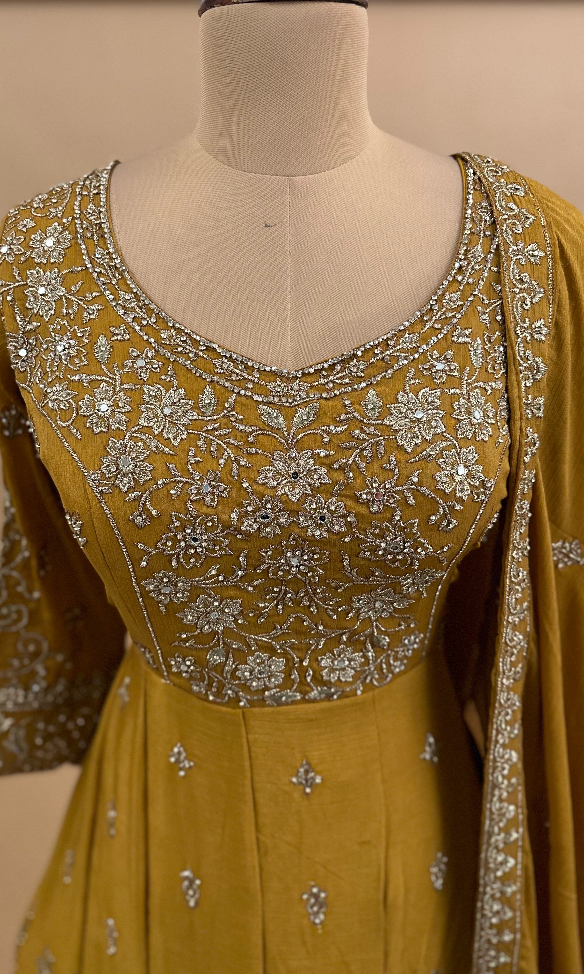 Elevate your festive wardrobe with this stunning dark yellow party wear ensemble. Crafted from luxurious chinon fabric, this long dress features intricate stone work embroidery that adds sophisticated glamour to every occasion. The coordinating dupatta completes the traditional look with elegance and grace. Perfect for weddings, celebrations, and formal events, this piece combines rich color with refined craftsmanship for a truly memorable appearance.