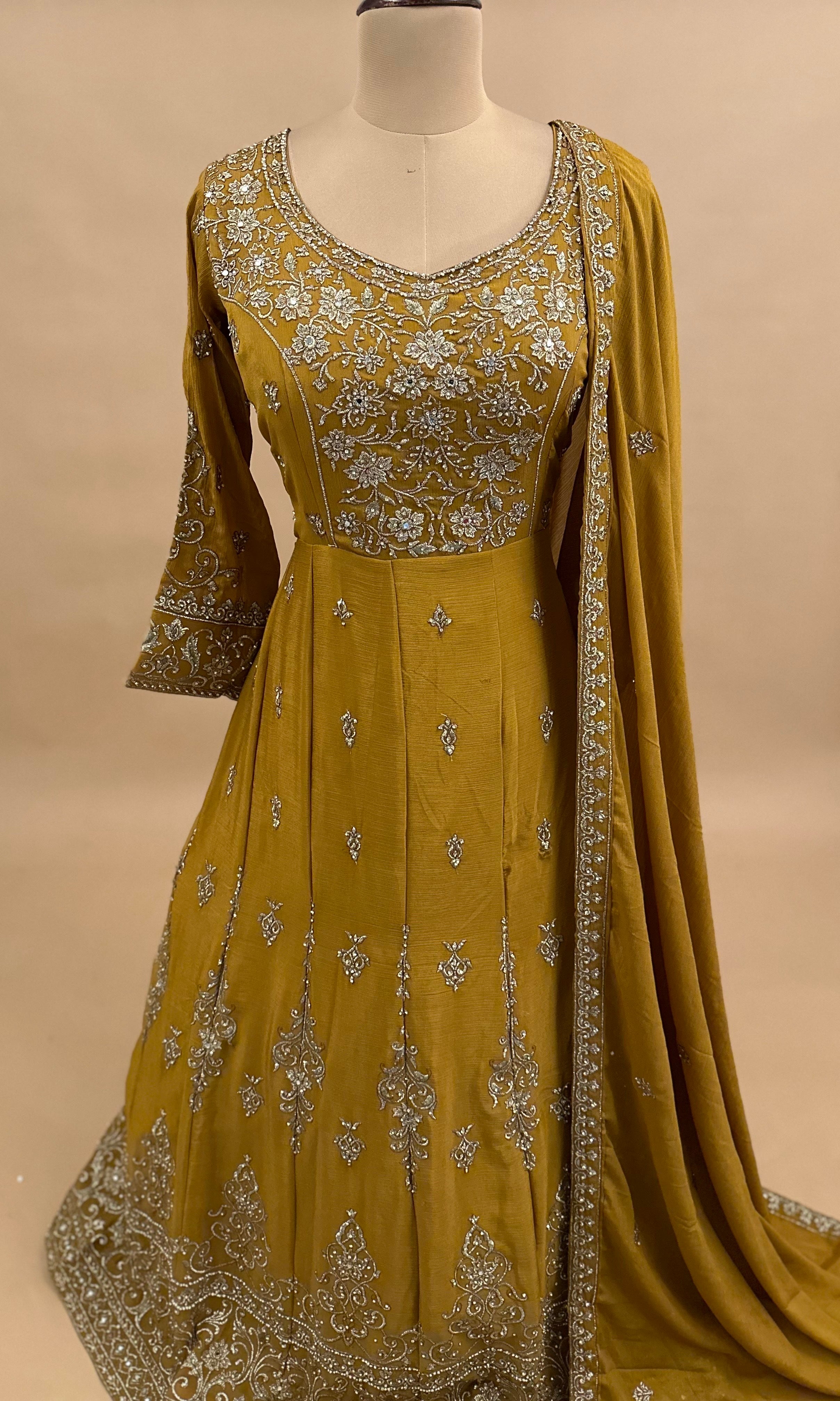 Dark Yellow Color Heavy Party Wear Long Dress With Dupatta