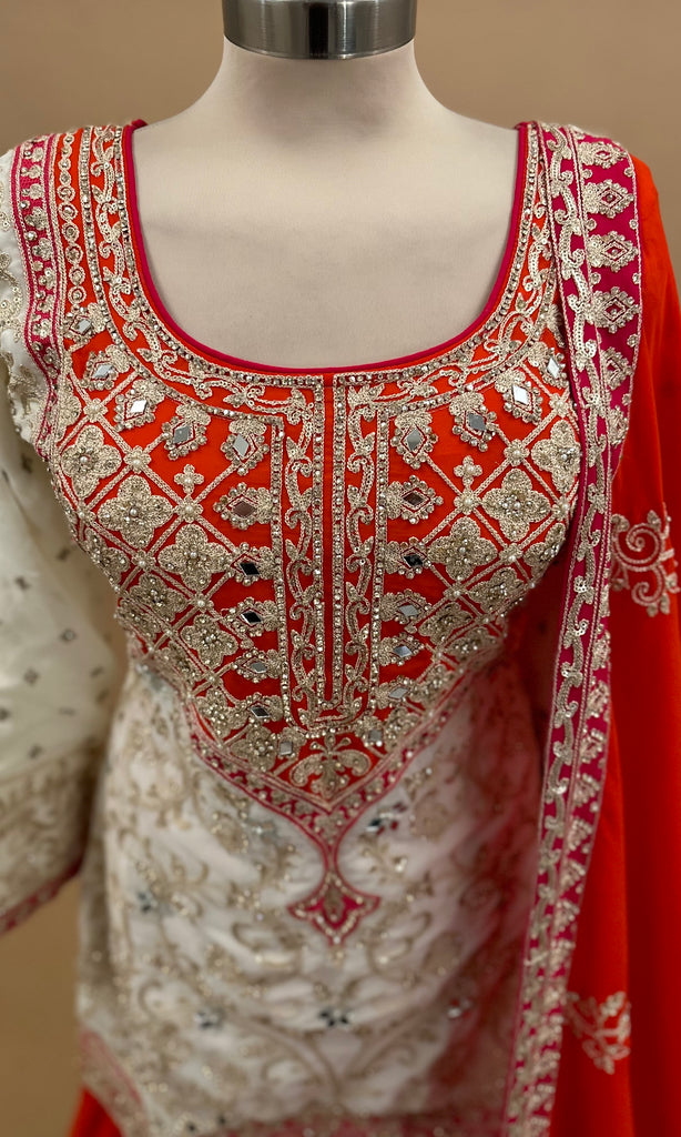 Elevate your festive wardrobe with this stunning sharara suit crafted from premium georgette fabric. The striking contrast color palette creates a sophisticated silhouette, while intricate mirror and stone embroidery work adds luxurious detail throughout. This party wear ensemble features a generously proportioned sharara bottom that drapes beautifully, paired with a coordinating kurta and dupatta. Perfect for weddings, celebrations, and special occasions, the lightweight georgette ensures comfort without compromising on elegance. The ornate embellishments catch light gracefully, making this a showstopping choice for those who appreciate traditional craftsmanship with contemporary flair.