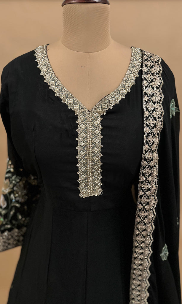 Elevate your evening wardrobe with this sophisticated black georgette long dress, expertly crafted for refined occasions. The lightweight, fluid georgette fabric drapes elegantly while maintaining its graceful silhouette throughout the day. Intricate stone work embroidery adorns the dress, adding a layer of luxury and visual interest to the design. The coordinating dupatta completes the ensemble, offering versatility in styling and an authentic touch to your traditional or contemporary look. Perfect for weddings, celebrations, and formal gatherings where understated elegance speaks volumes.