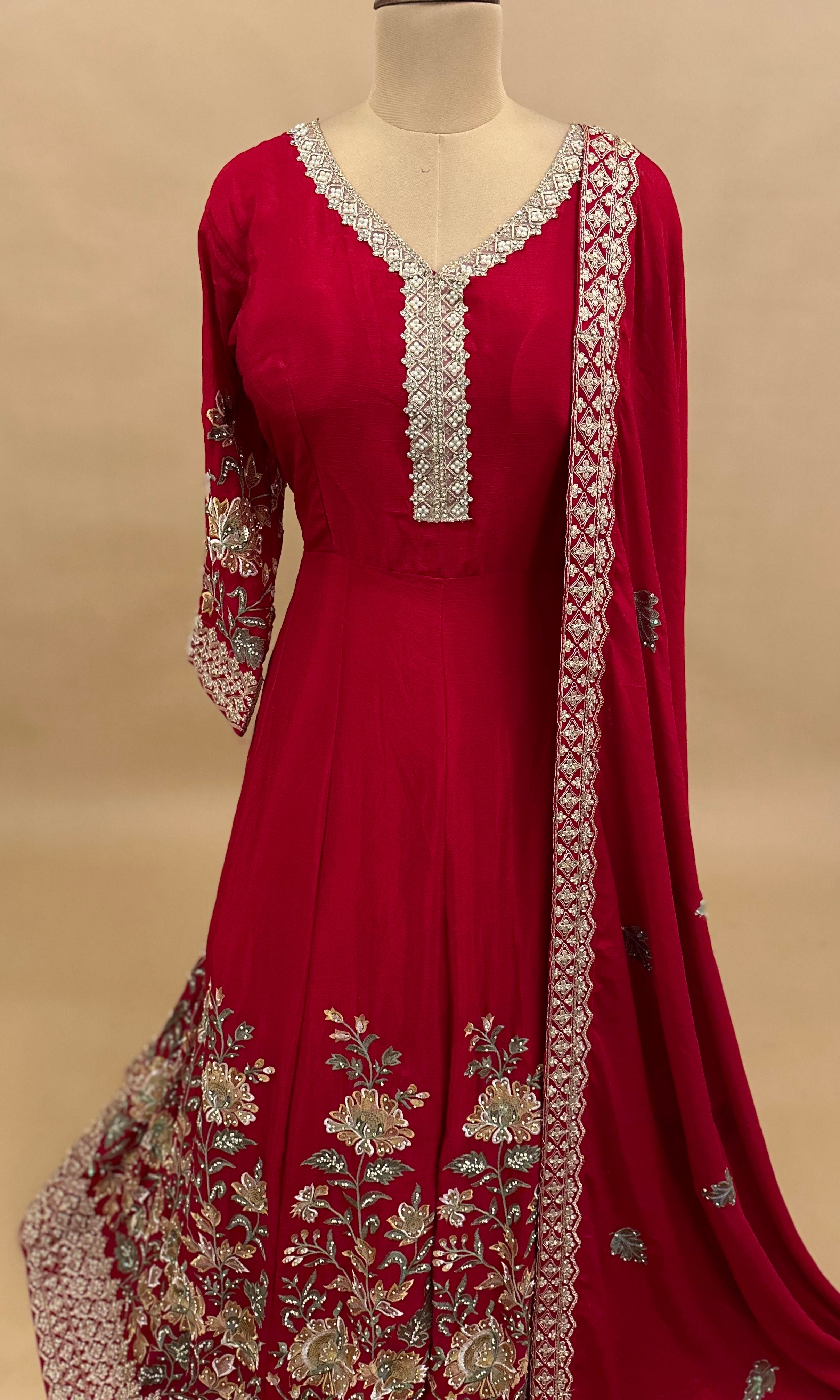 Georgette Fabric Party Wear Red Color Long Dress With Dupatta