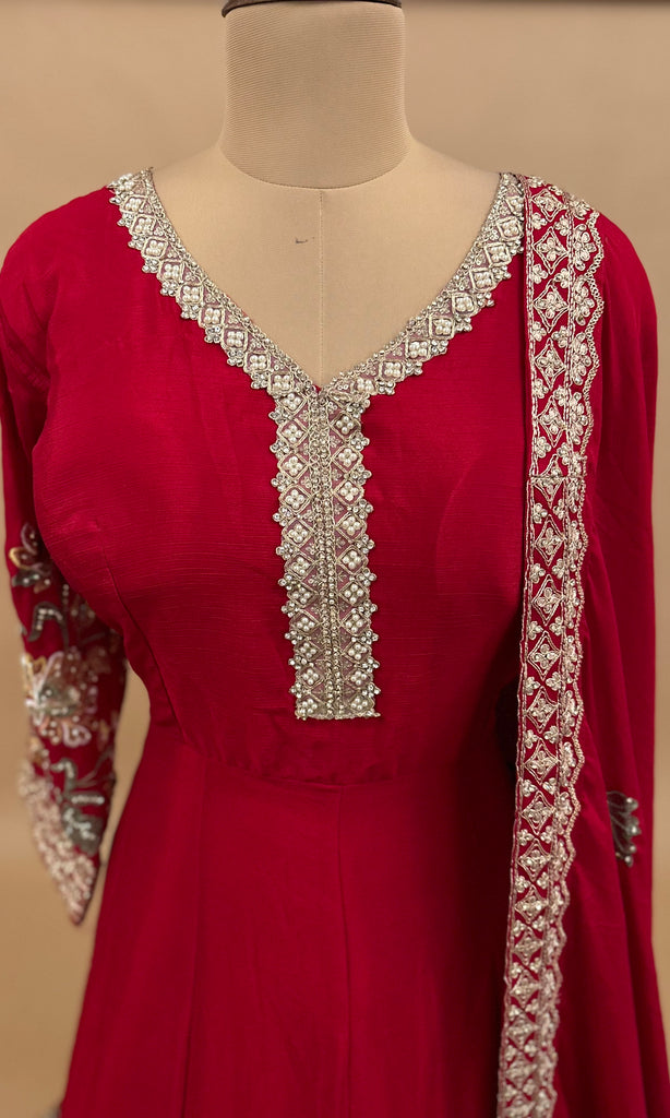 Elevate your evening wardrobe with this sophisticated Red georgette long dress, expertly crafted for refined occasions. The lightweight, fluid georgette fabric drapes elegantly while maintaining its graceful silhouette throughout the day. Intricate stone work embroidery adorns the dress, adding a layer of luxury and visual interest to the design. The coordinating dupatta completes the ensemble, offering versatility in styling and an authentic touch to your traditional or contemporary look. Perfect for weddings, celebrations, and formal gatherings where understated elegance speaks volumes.