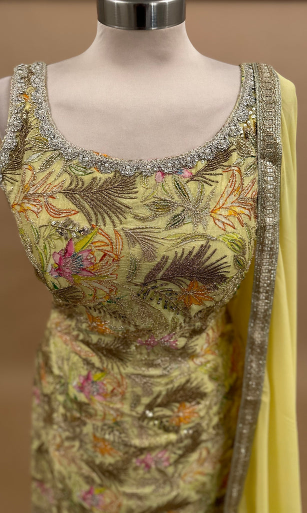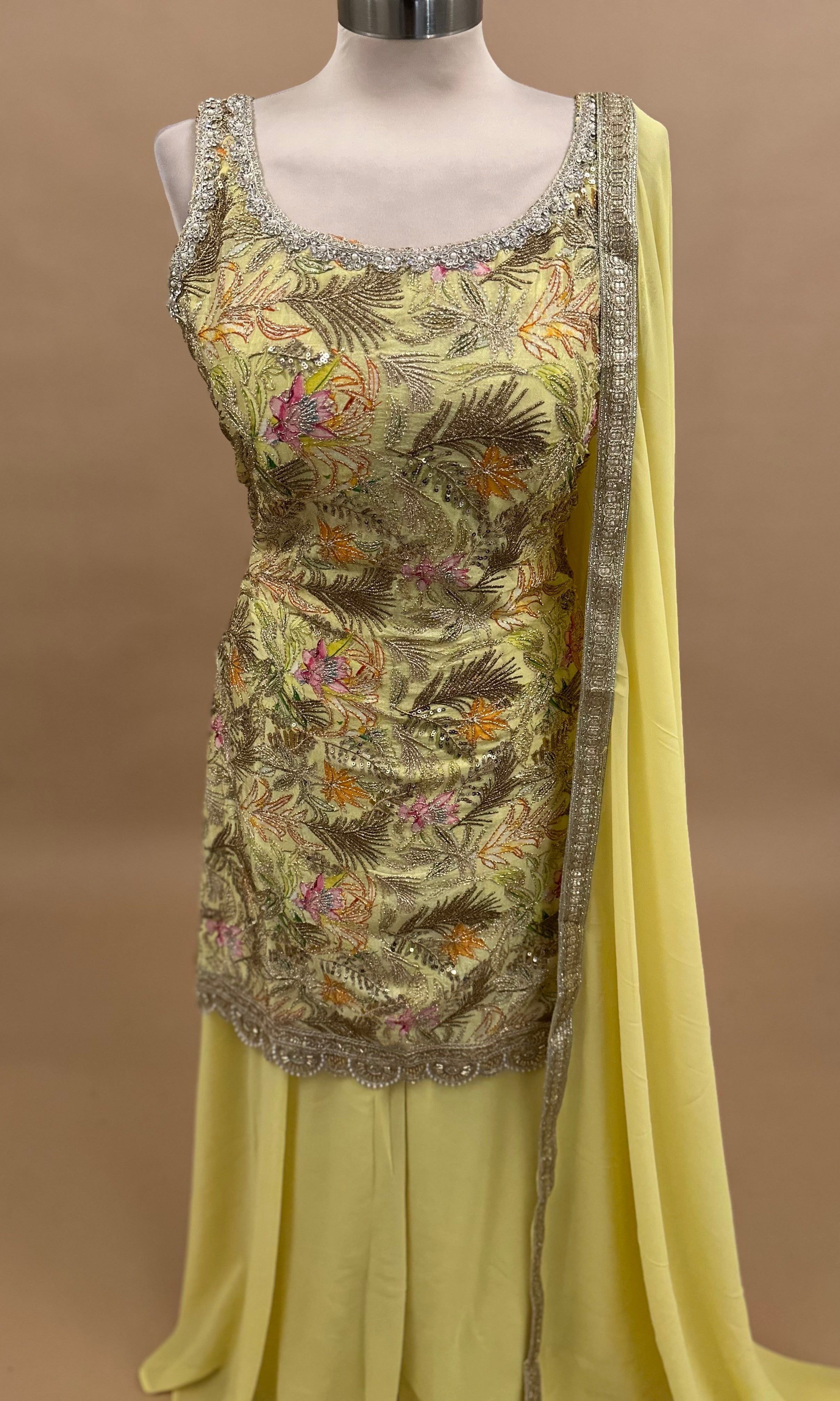 This lightweight Yellow palazzo suit features exquisite sequin embroidery on soft georgette fabric, offering both elegance and comfort. The flowing silhouette paired with a matching dupatta creates a graceful ensemble ideal for festive occasions or formal gatherings. Its delicate sequin work adds subtle shimmer, enhancing the sophisticated appeal without compromising ease of wear.