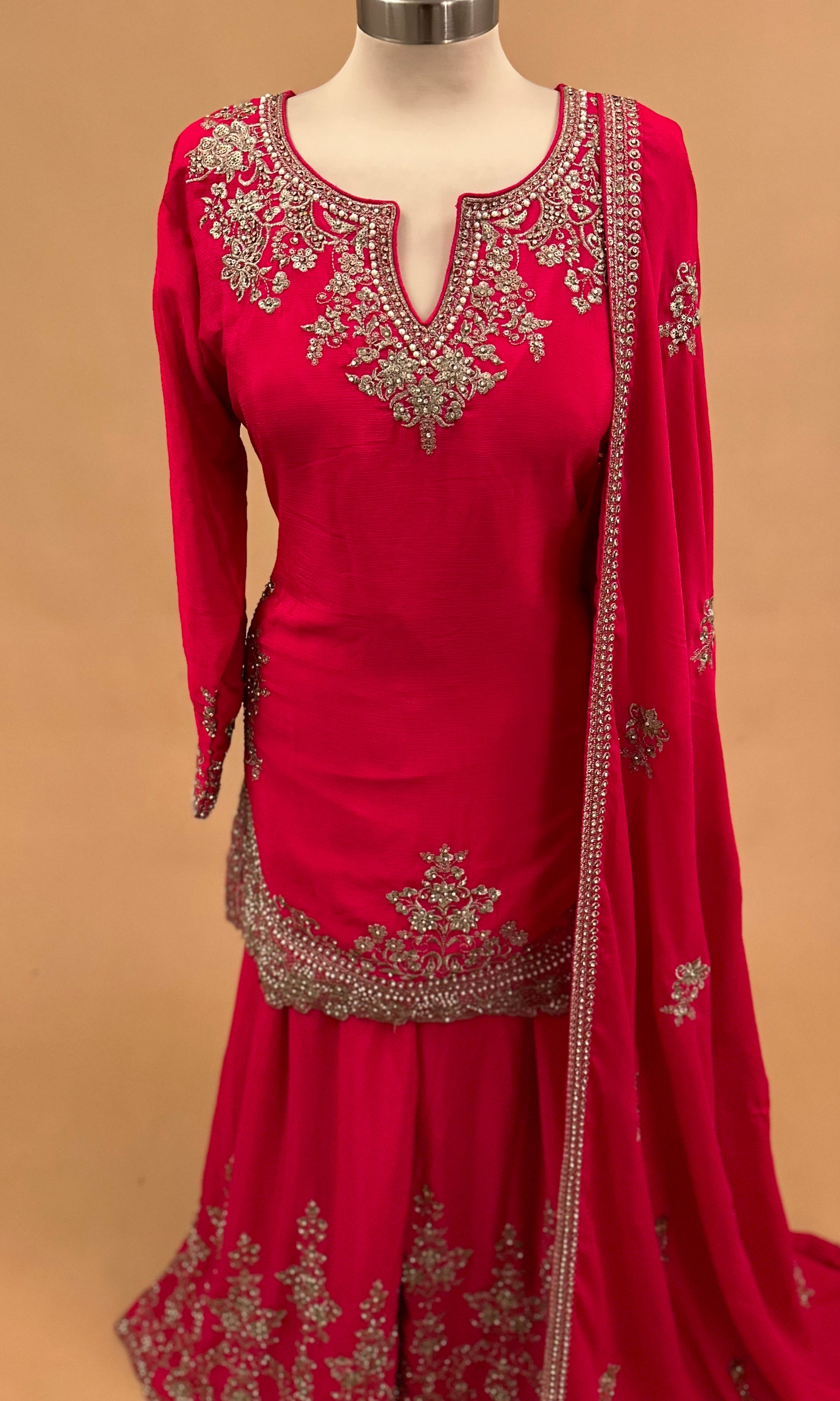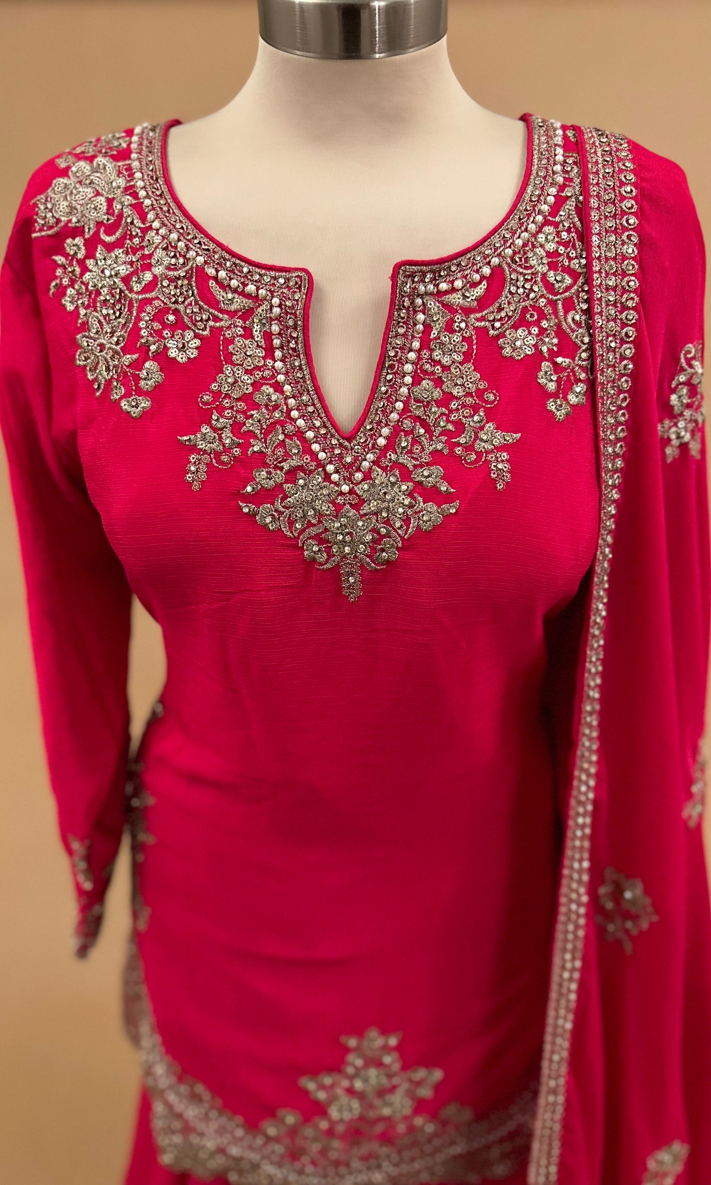Elevate your party style with our Pearl And Stone Work Embroiderey Magenta Color Palazzo Suit! The intricate embroidery and sparkling pearl and stone work add a touch of sophistication to your look. Made with high-quality Chinon fabric, this suit promises both comfort and style. Complete your ensemble with the matching dupatta.