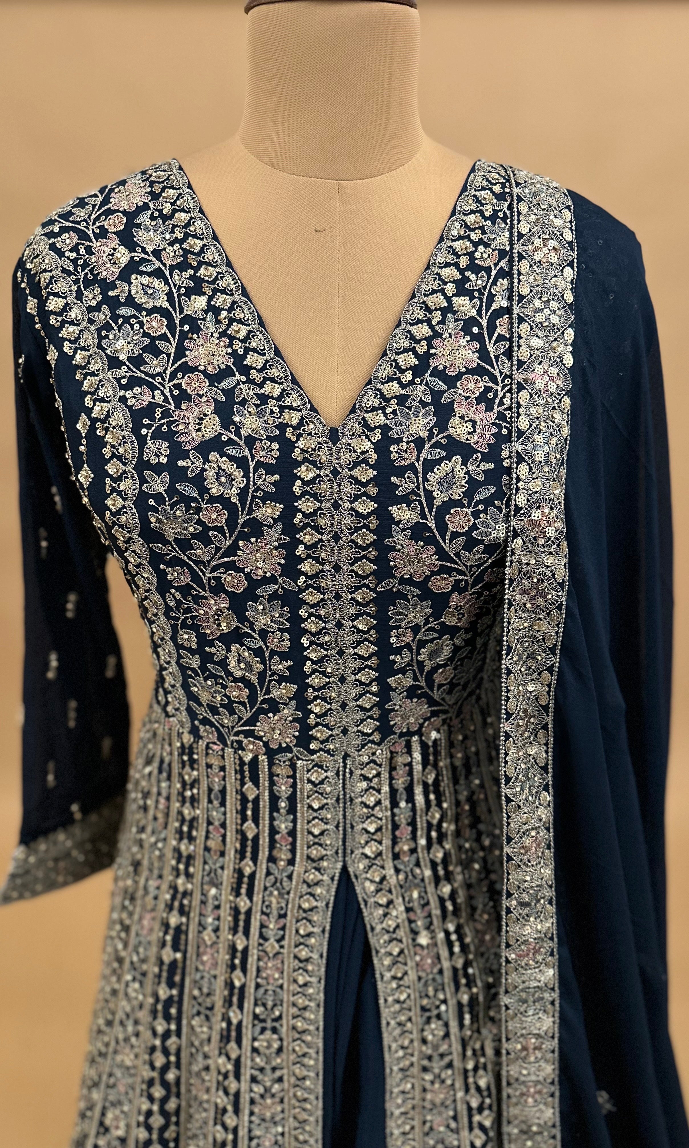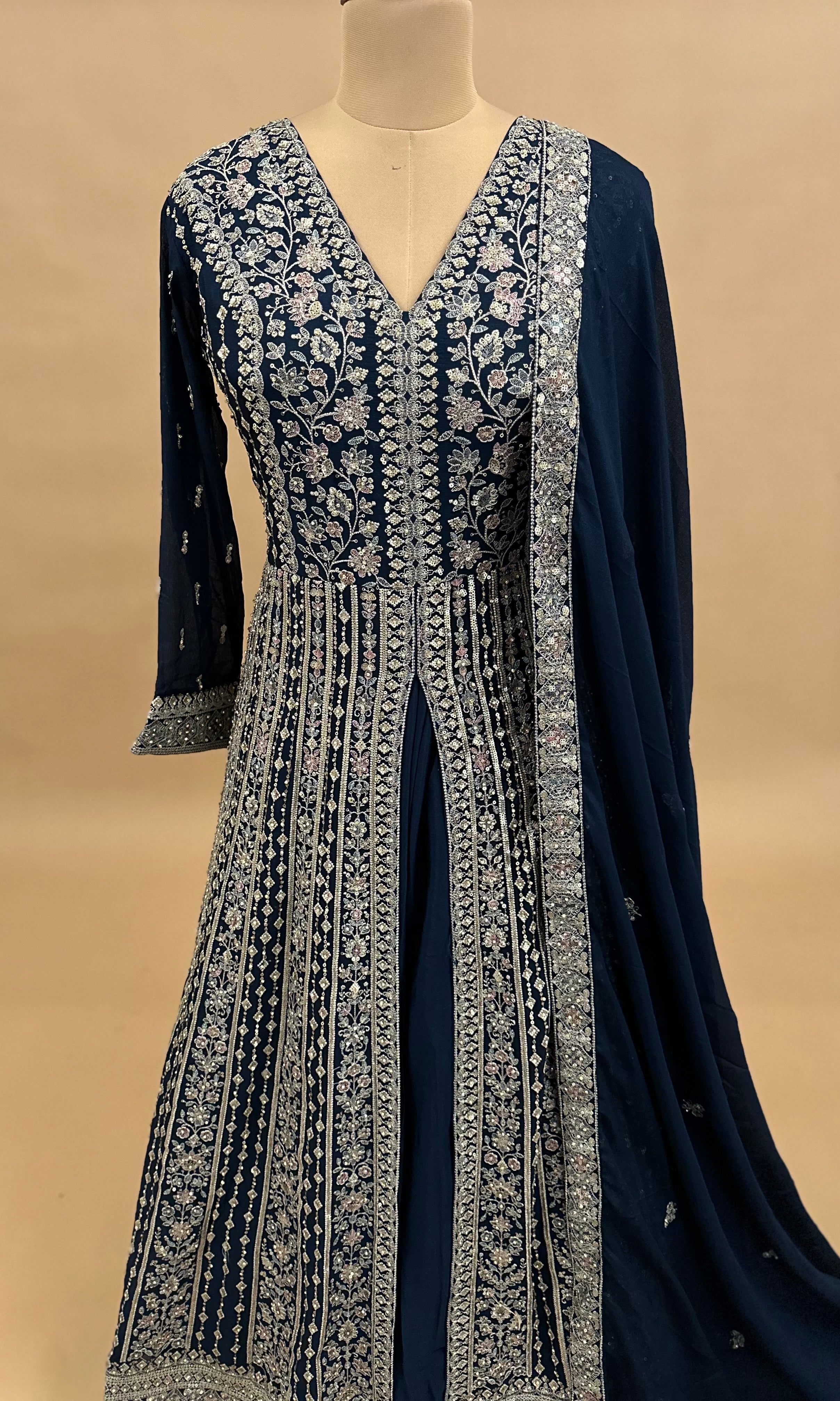 Elevate your ethnic wardrobe with this stunning teal blue Indo Western dress, expertly crafted for sophisticated occasions. The piece features intricate stone work embroidery that adds luxurious detail and visual depth. Constructed from premium chinon fabric, known for its lightweight drape and elegant sheen, this dress offers both comfort and refined style. The coordinating dupatta completes the ensemble, providing versatility for layering and styling. Perfect for weddings, celebrations, and upscale events, this heavy party wear piece combines traditional craftsmanship with contemporary silhouettes for a truly distinctive look.