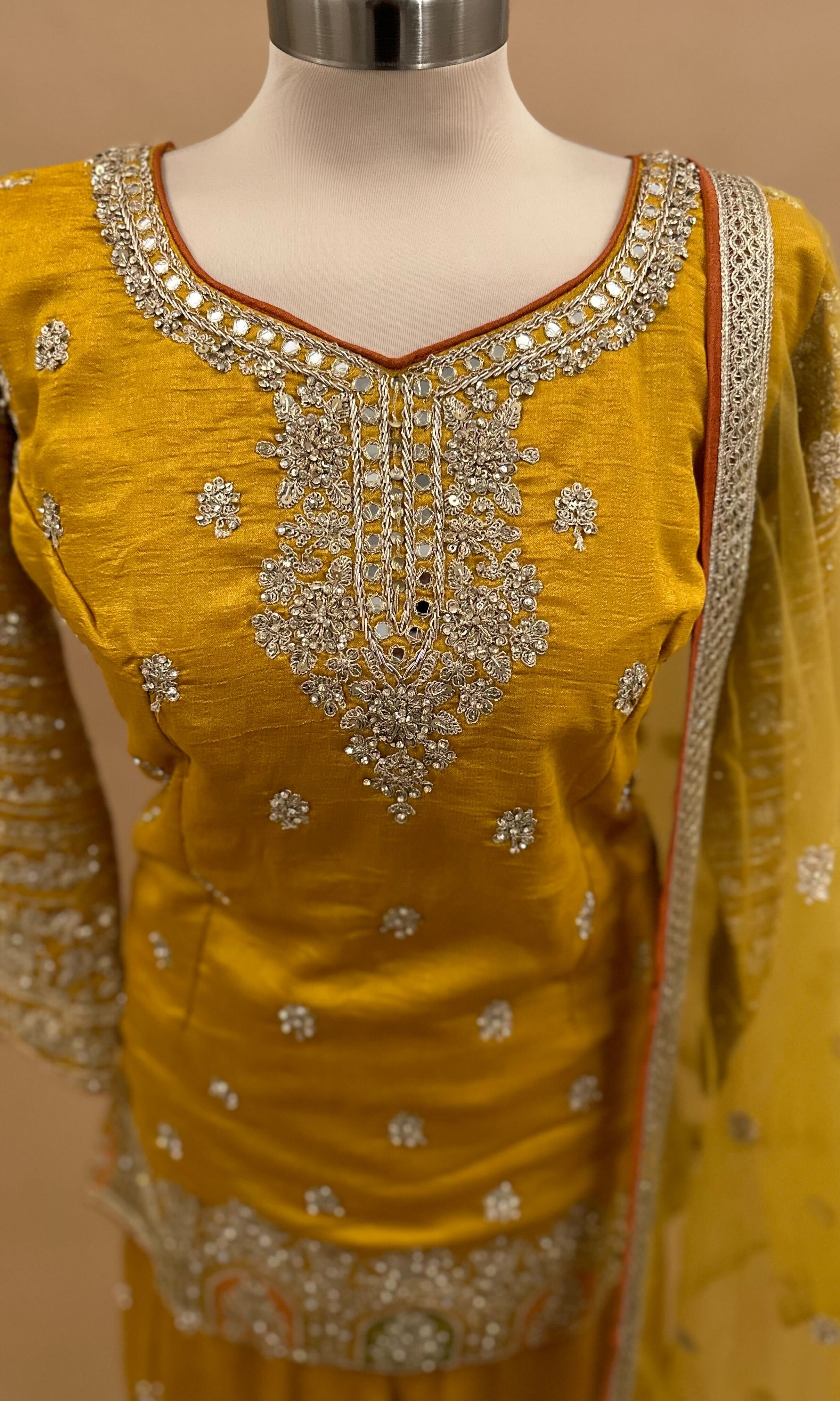 This lightweight palazzo suit features vibrant yellow Chinon fabric, offering both comfort and style for warm weather. Detailed with exquisite stone embroidery, it adds a refined elegance to the overall look. The matching dupatta complements the ensemble, making it ideal for festive or casual occasions where subtle sophistication is desired.