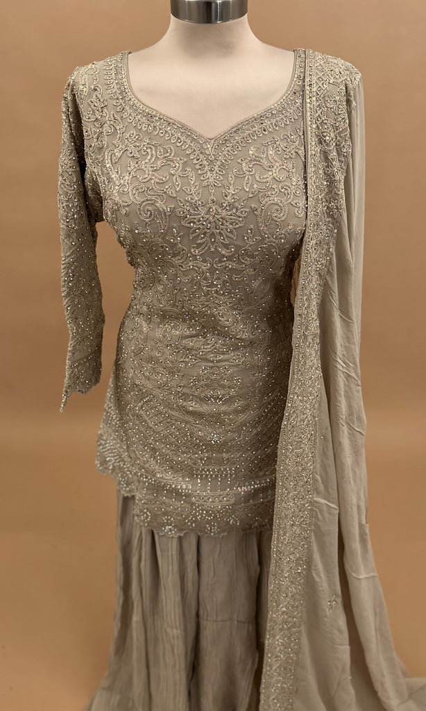 Georgette Fabric Stone Work Embroiderey Light Champagne Color Palazzo Suit With Dupatta