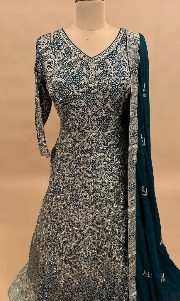 Full Sleeves Teal Color Heavy Long Dress On Georgette Fabric With Dupatta