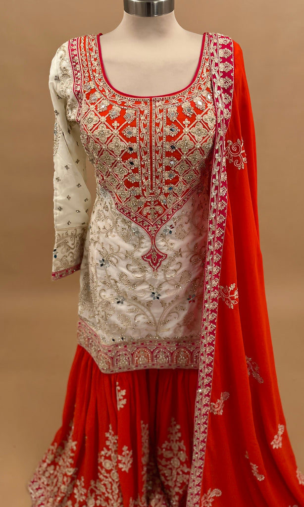 Georgette Fabric Contrast Color Party Wear Heavy Sharara Suit With Dupatta