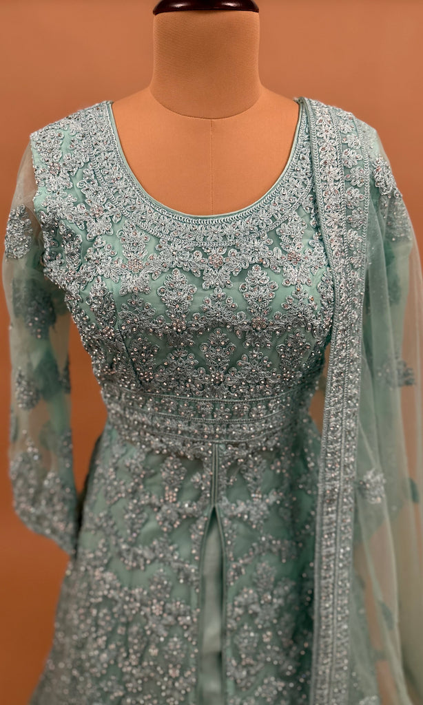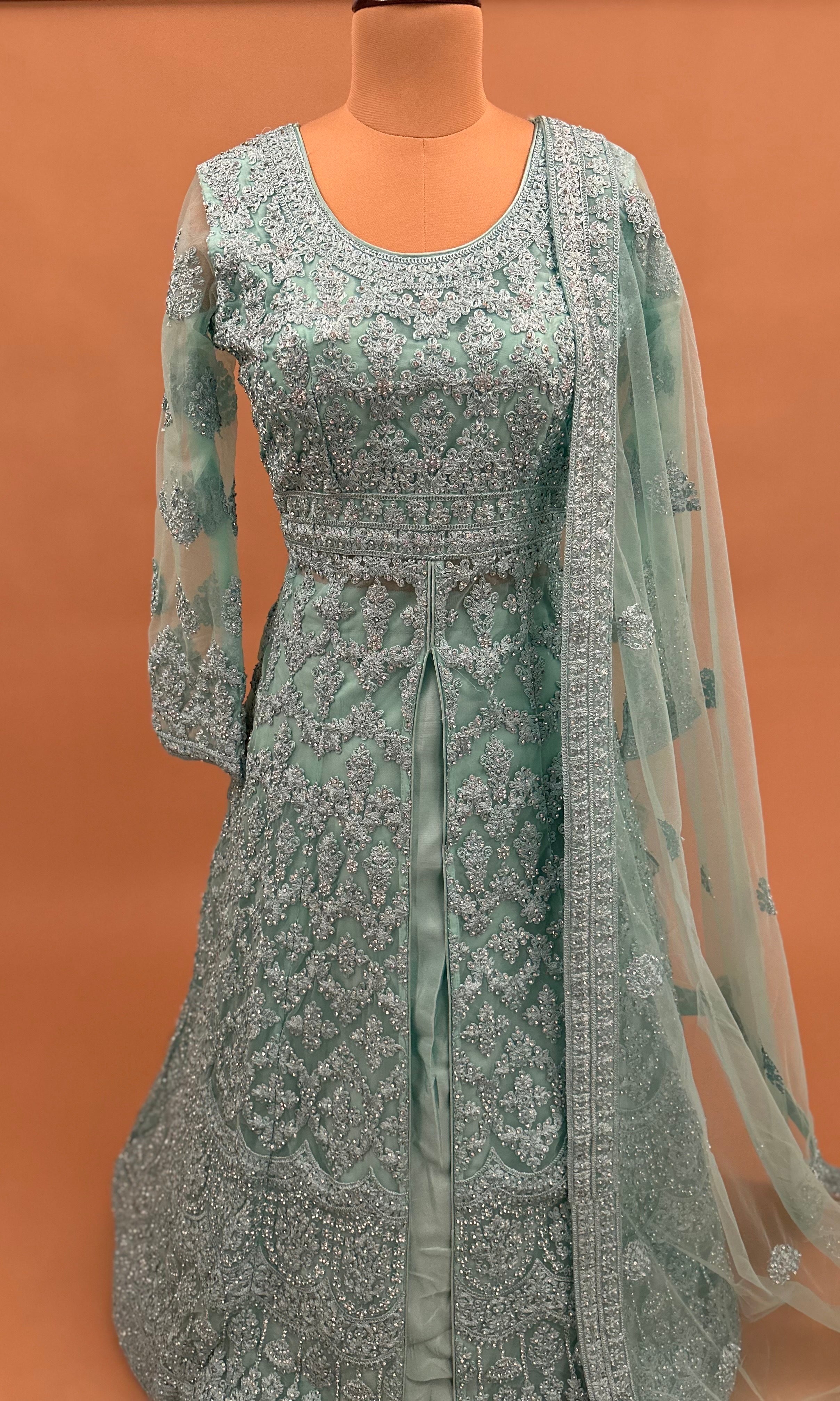 Expertly crafted with net fabric, this Indo-Western Front Cut Blue Color Suit is embroidered with stone work. The 4 piece set comes with a beautiful dupatta. Perfect for formal occasions, this suit exudes elegance and style.