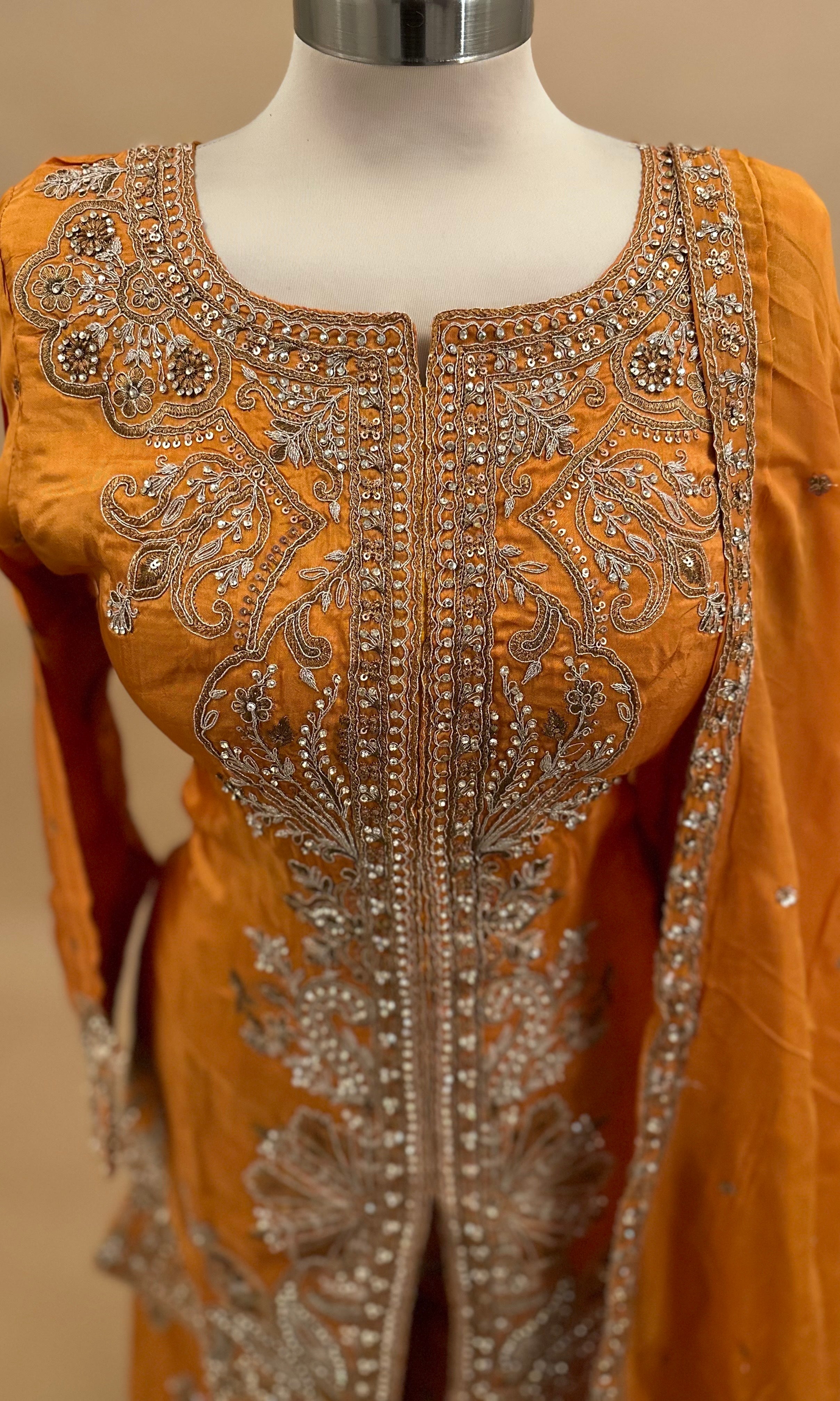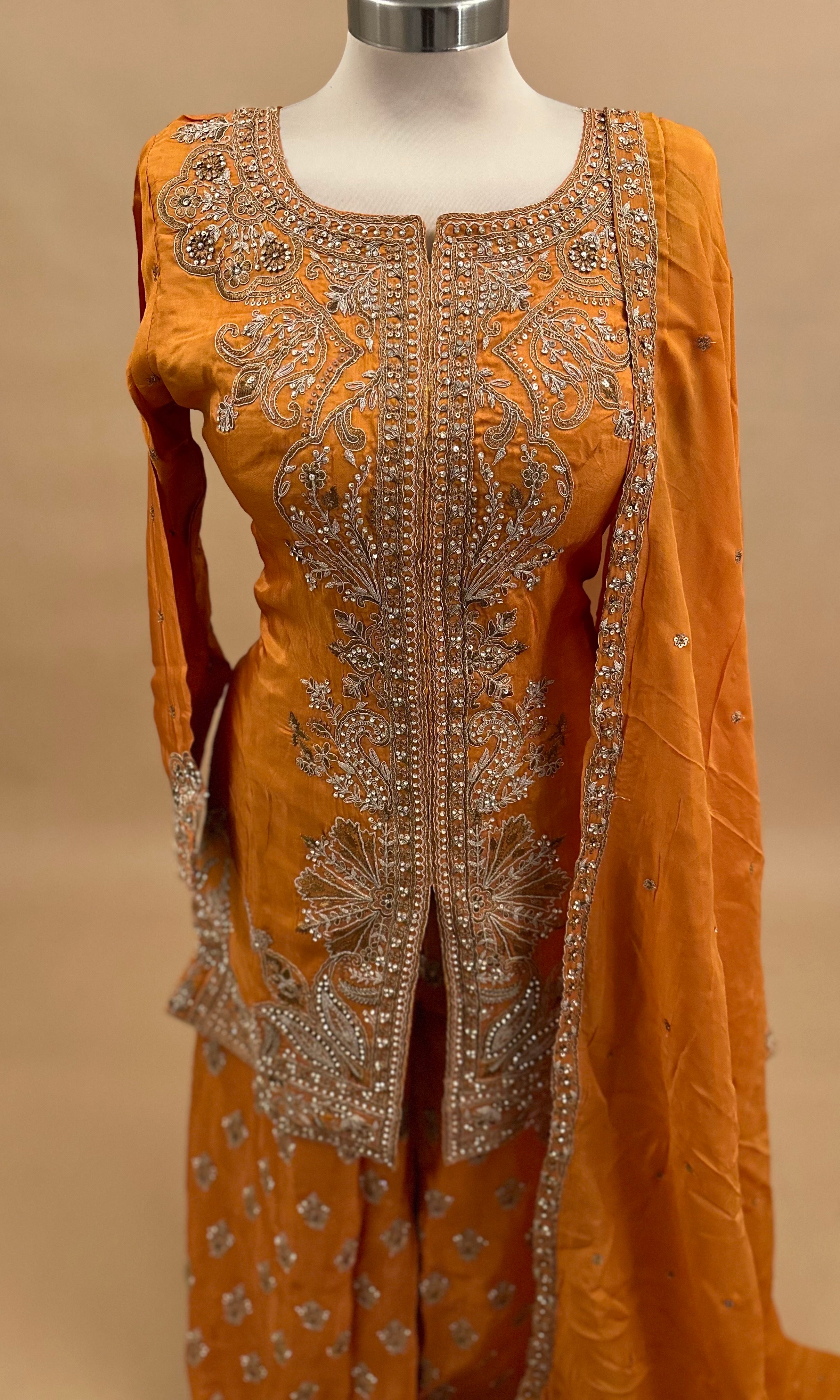 Elevate your party wardrobe with this striking orange palazzo suit, expertly crafted to blend traditional Indo-Western aesthetics with contemporary elegance. The shimmer fabric catches light beautifully, creating a luminous effect perfect for evening celebrations. Intricate stone work embroidery adorns the ensemble, adding sophisticated texture and visual depth. The flowing palazzo silhouette offers graceful movement and comfort, while the coordinating dupatta completes the refined look. Ideal for weddings, festive gatherings, and special occasions where you want to make a memorable impression.