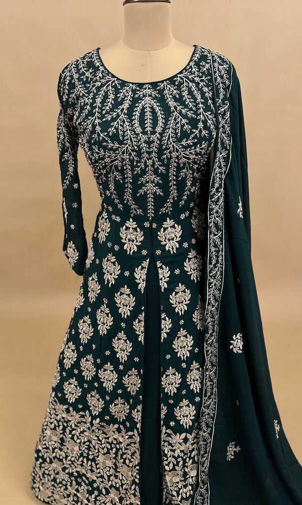 Dark Green Color Stone Work Embroiderey Indo Western Dress On Premium Silk Fabric With Dupatta