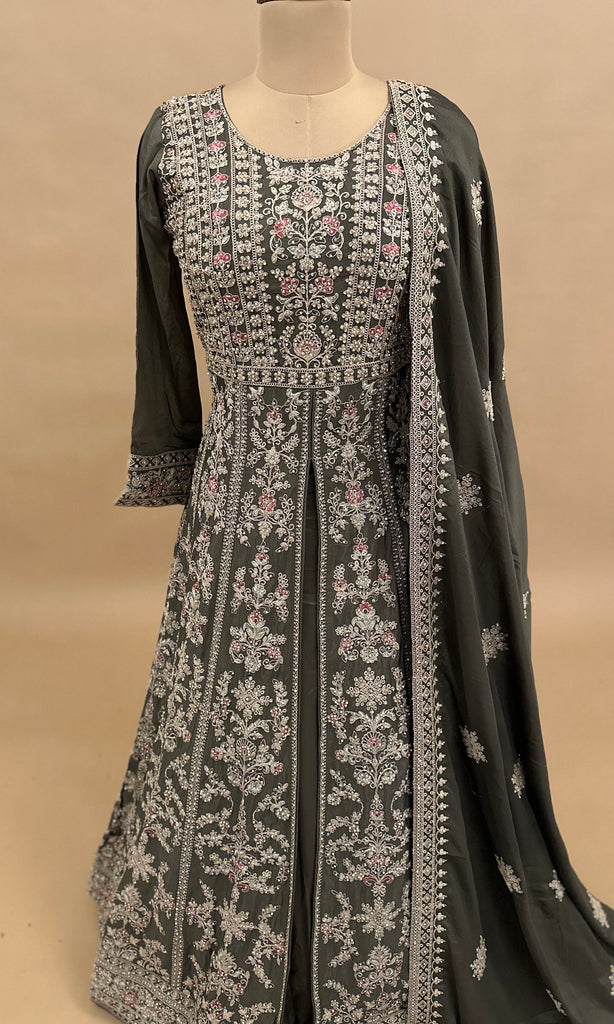Dark Olive Green Color On Chinon Fabric Indo Western Dress With Dupatta