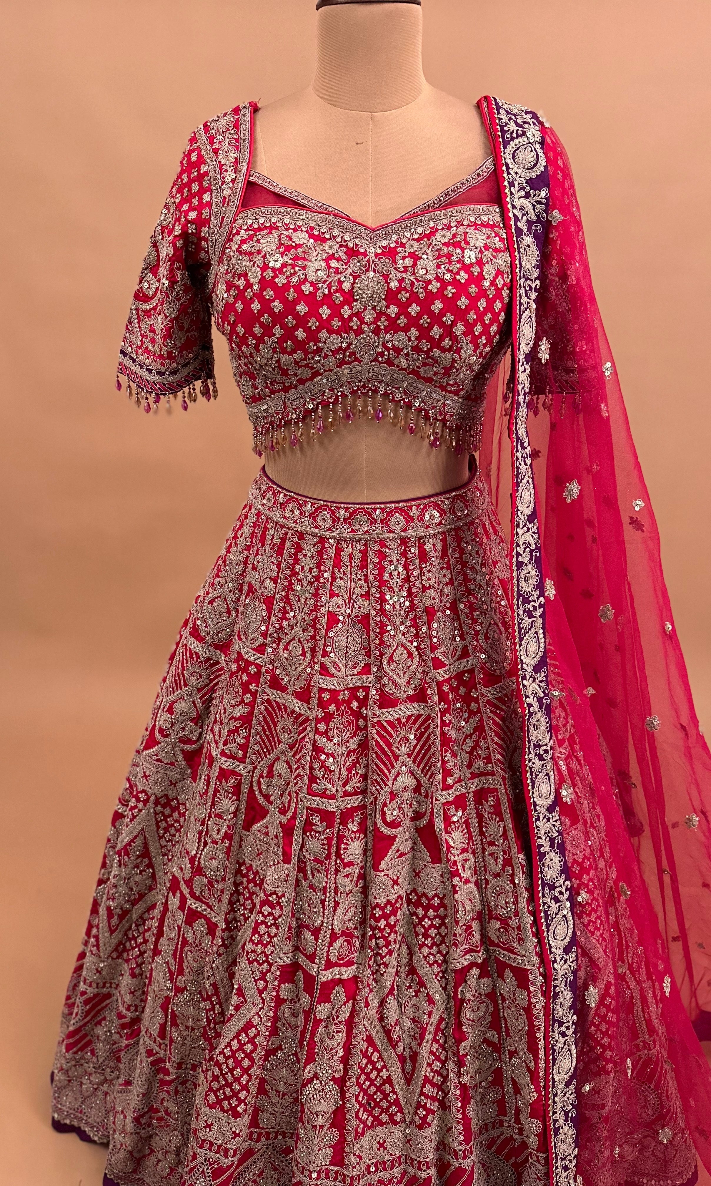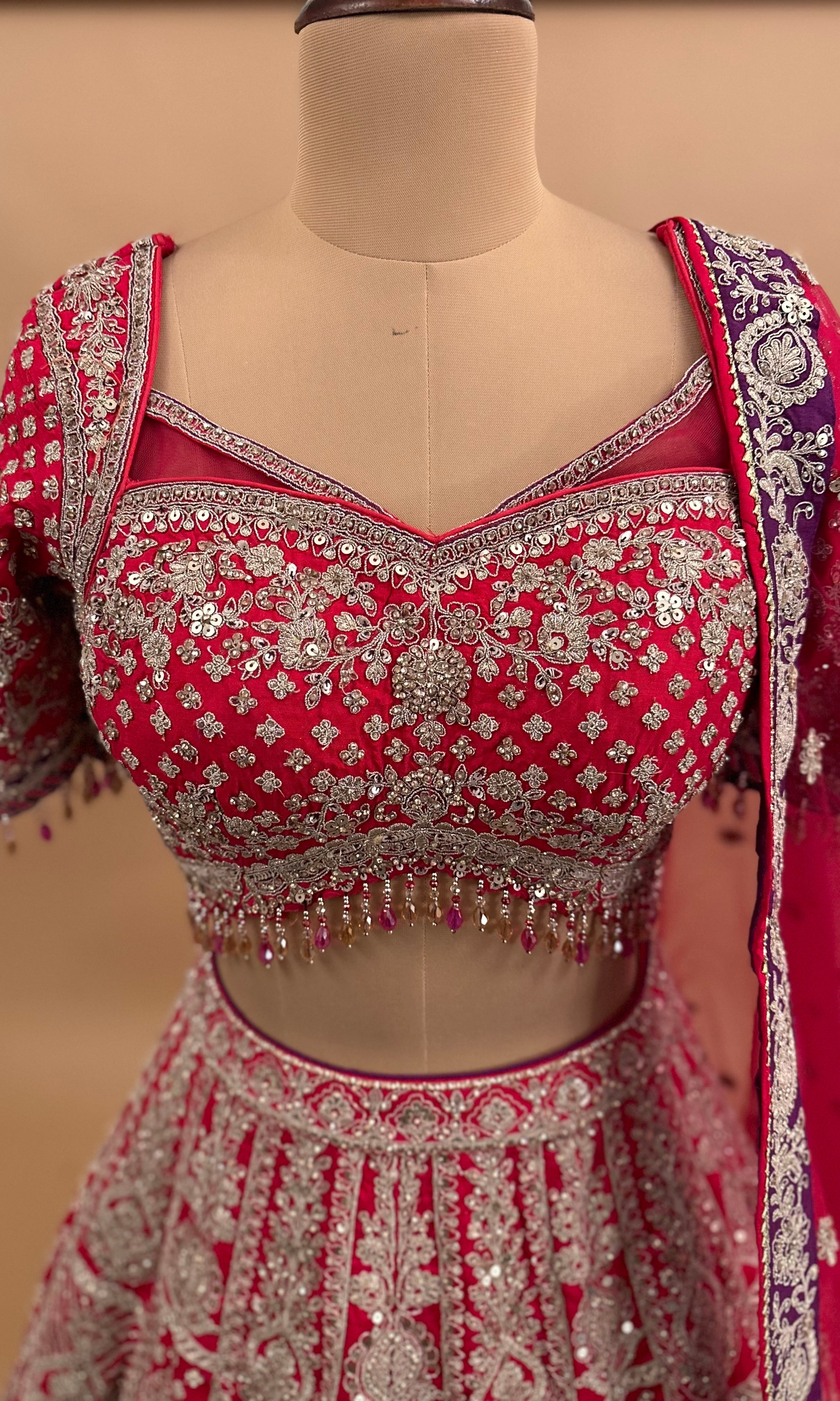 Elevate your celebration wardrobe with this stunning Dasheen fabric lehenga set in a rich pinkish-red hue. Crafted from premium Dasheen material, this heavy-weight ensemble delivers the structure and drape essential for formal occasions.