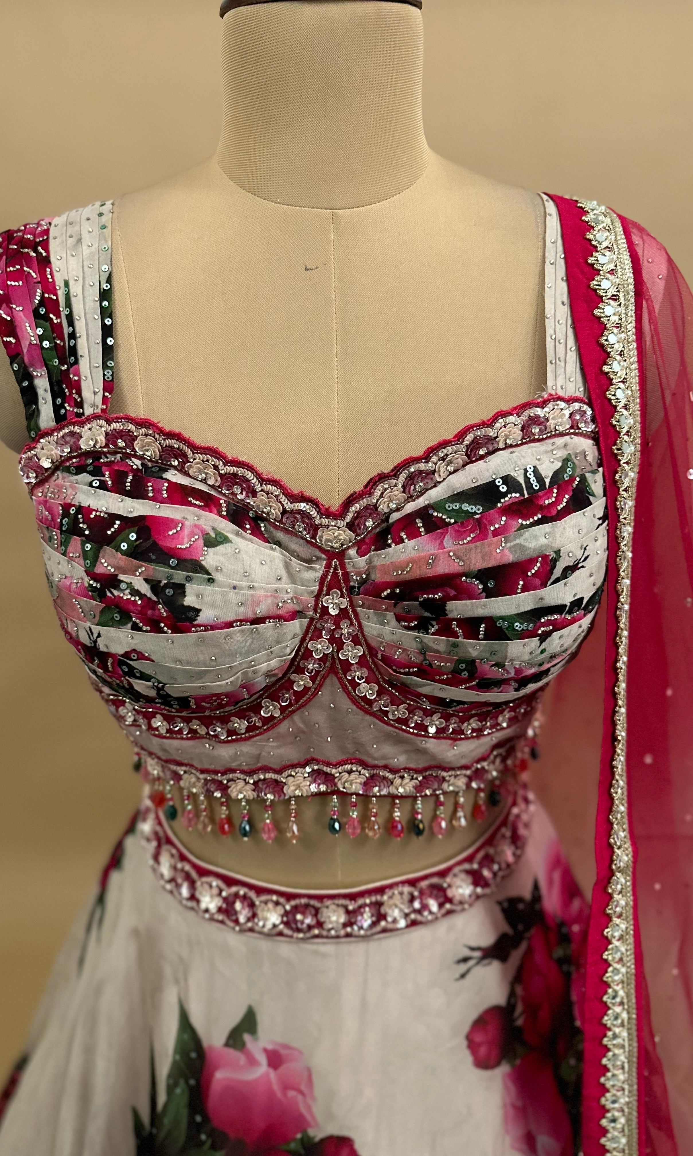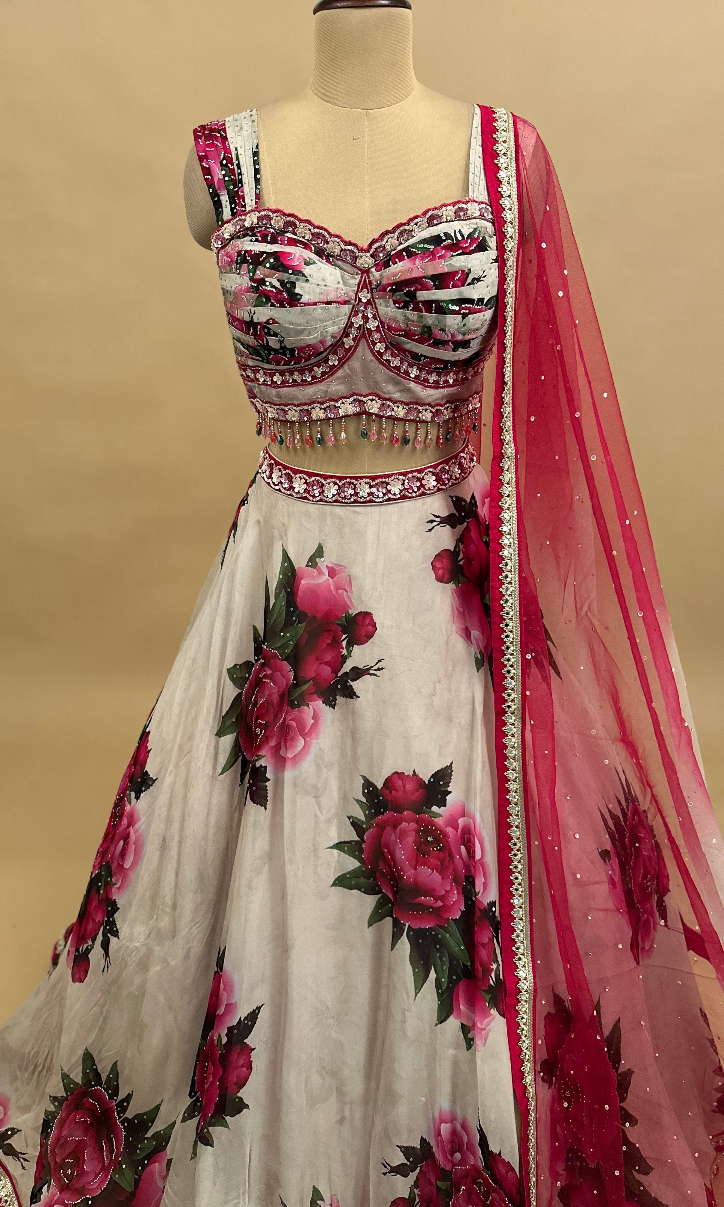 Elevate your festive wardrobe with this stunning lehenga choli set crafted from premium organza fabric. The ensemble features an exquisitely embroidered design adorned with intricate sequin work that catches light beautifully. The voluminous flared bottom creates an elegant silhouette perfect for weddings, celebrations, and special occasions. Includes a coordinating dupatta to complete your traditional look. This sophisticated three-piece set combines timeless craftsmanship with contemporary flair, making it an ideal choice for those seeking refined ethnic elegance.