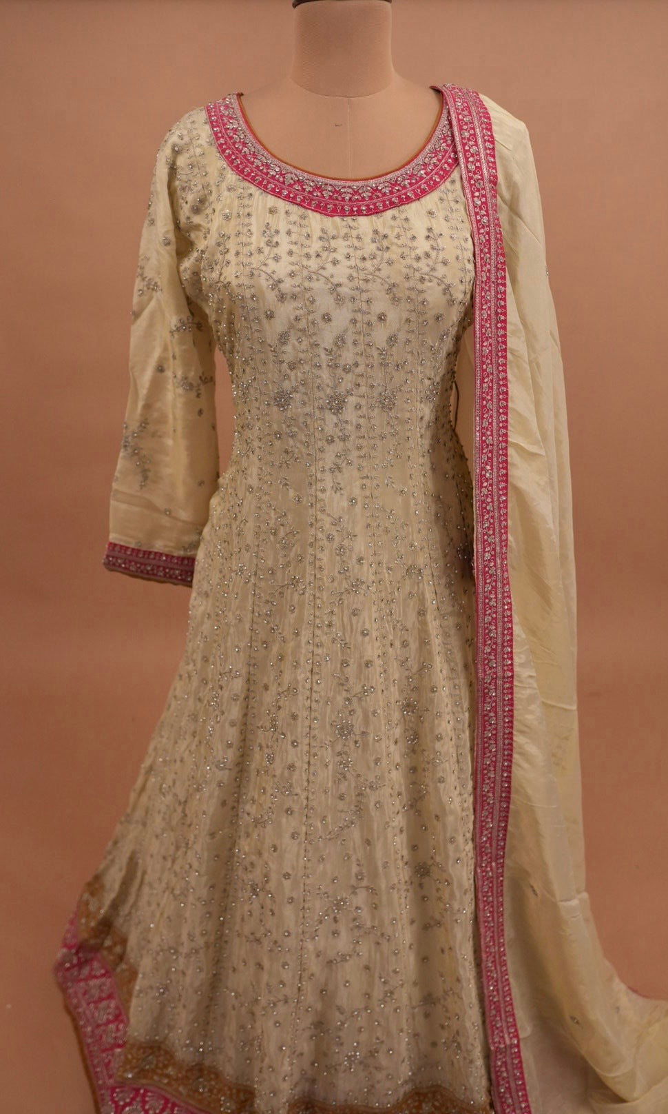 Elevate your festive wardrobe with this exquisite Chinon fabric long dress, meticulously crafted for special occasions. The ivory ensemble features intricate stone work embroidery that catches light beautifully, creating an elegant statement piece. Chinon's lightweight yet structured fabric drapes gracefully while maintaining its shape throughout the day. The coordinating dupatta adds versatility and traditional charm to your look. Perfect for weddings, celebrations, and formal gatherings, this dress combines timeless sophistication with contemporary design. The detailed embellishment work showcases superior craftsmanship, making it a standout choice for those who appreciate refined ethnic fashion.