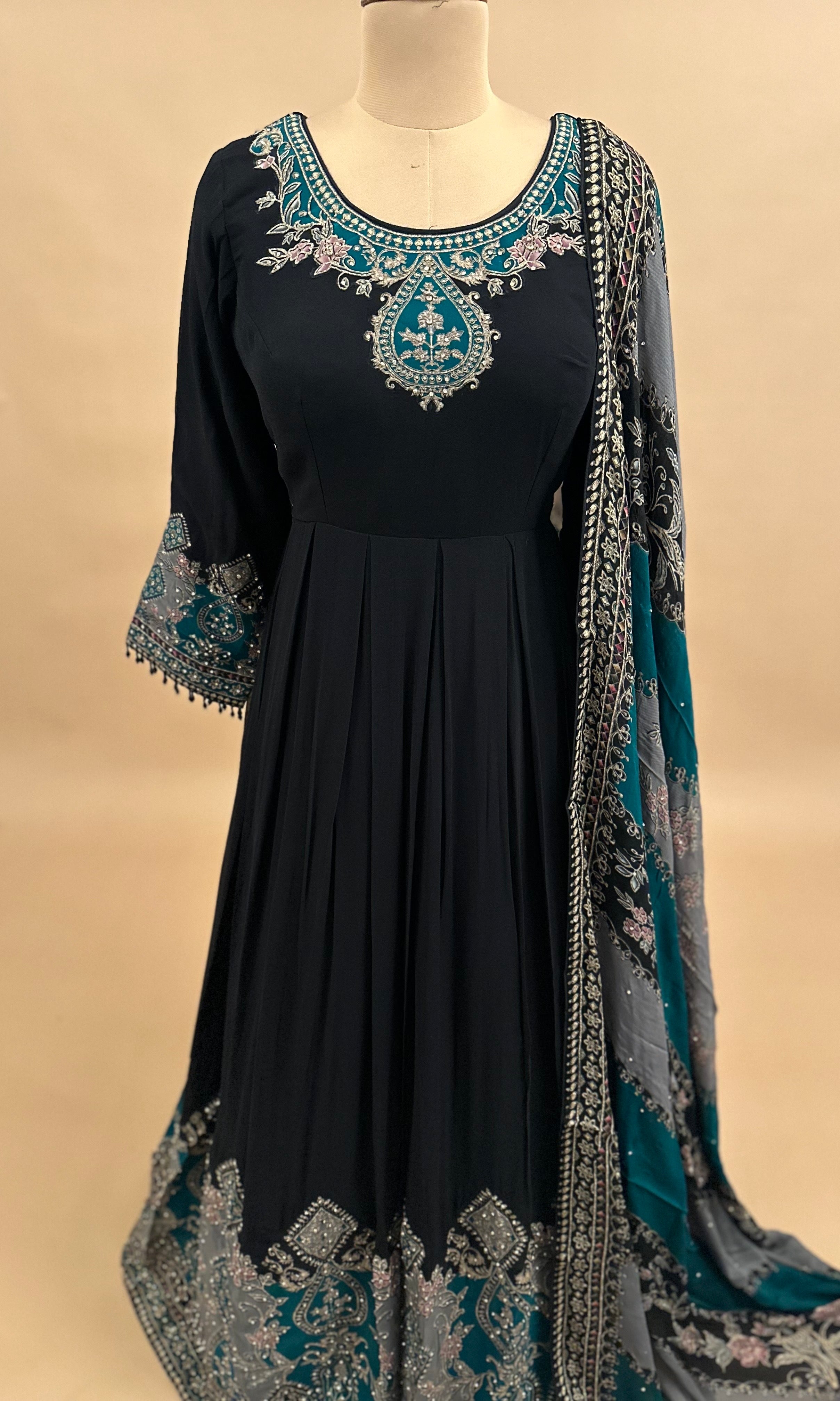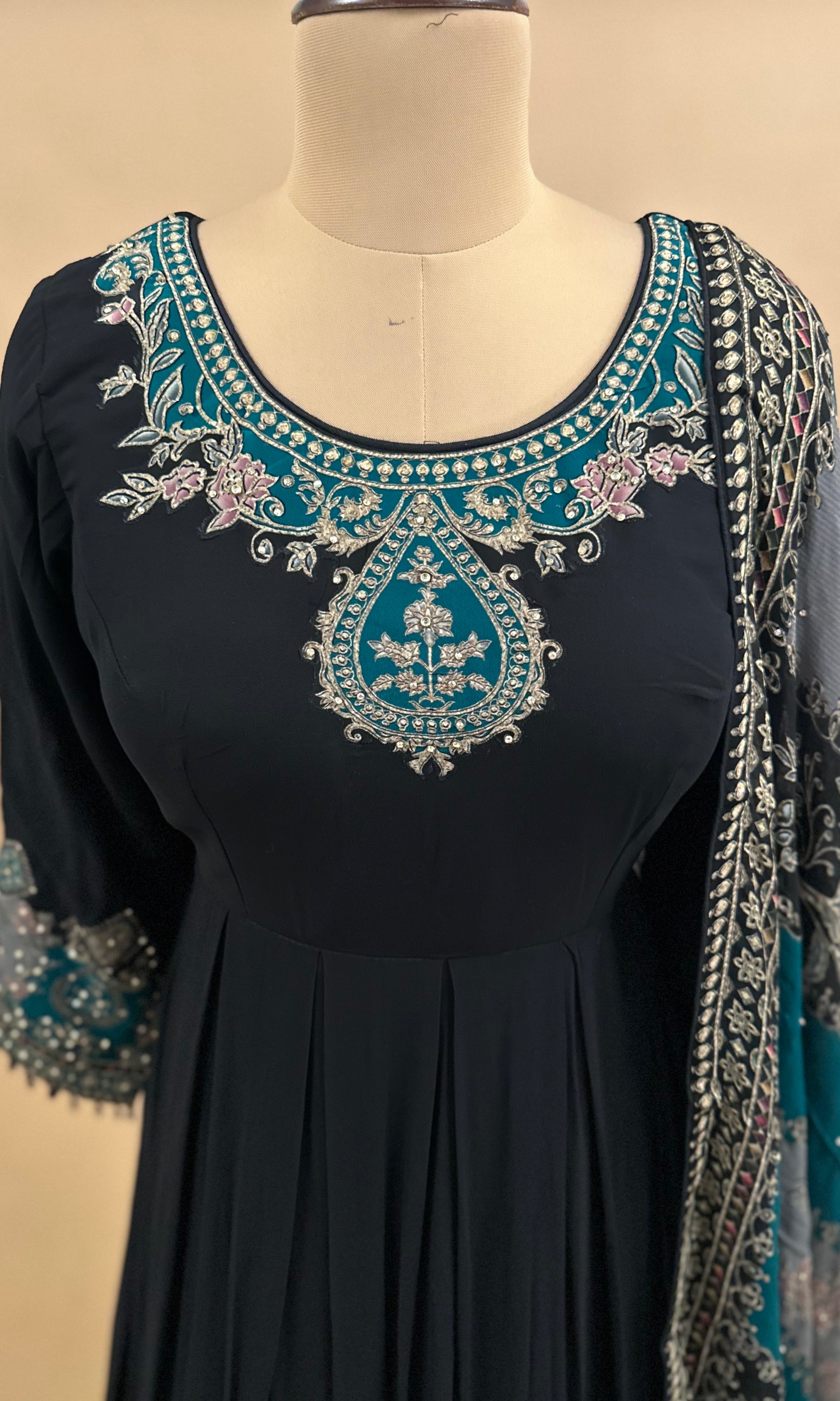 Elevate your evening elegance with this sophisticated black georgette dress, expertly crafted for discerning occasions. The lightweight, fluid georgette fabric drapes beautifully, creating a graceful silhouette that moves with refined grace. Intricate stone work embroidery adorns the design, adding luxurious detail and visual depth. Paired with a coordinating dupatta, this ensemble offers versatile styling options for weddings, celebrations, and formal gatherings. The timeless black palette ensures effortless coordination with your existing accessories while maintaining a polished, upscale appearance.
