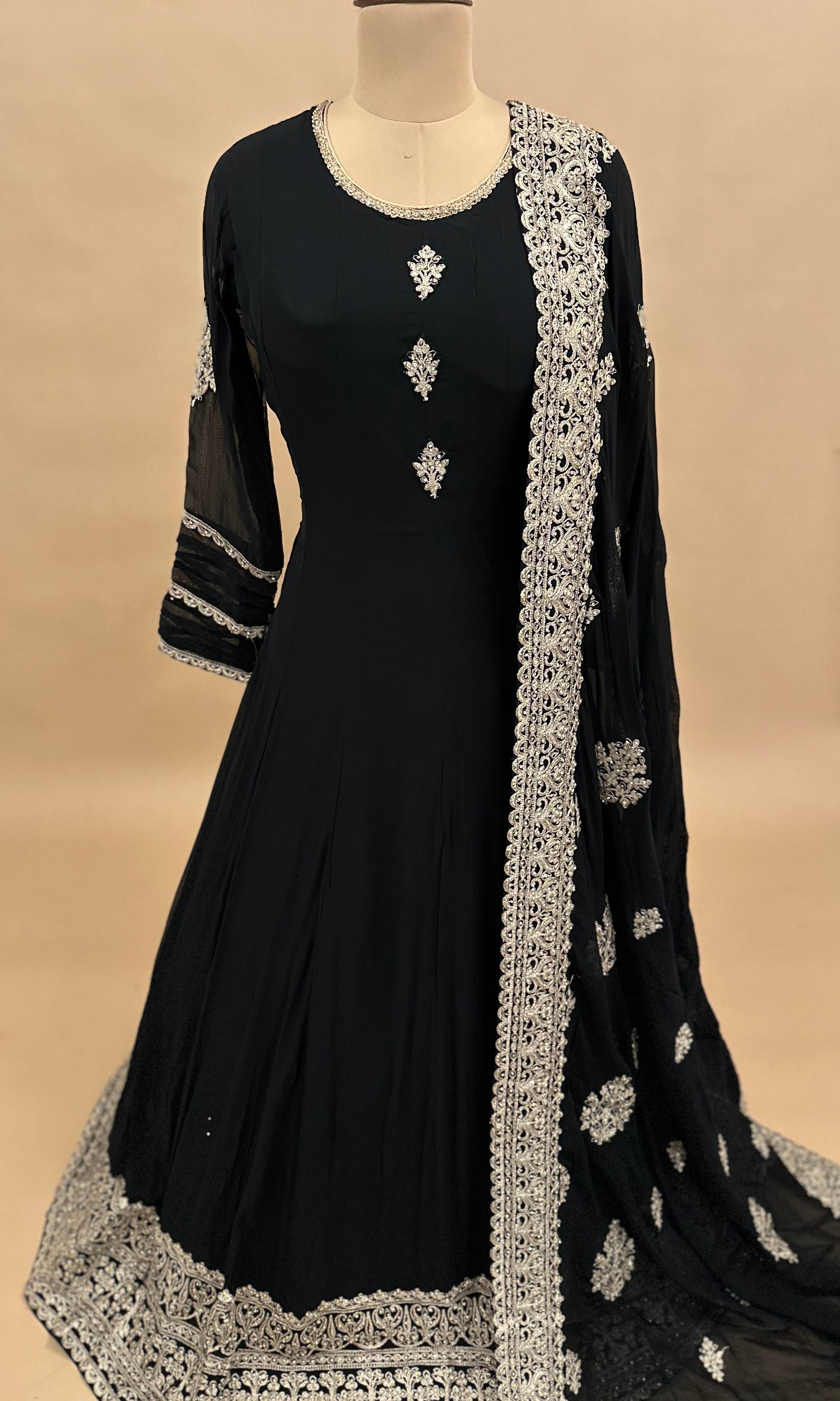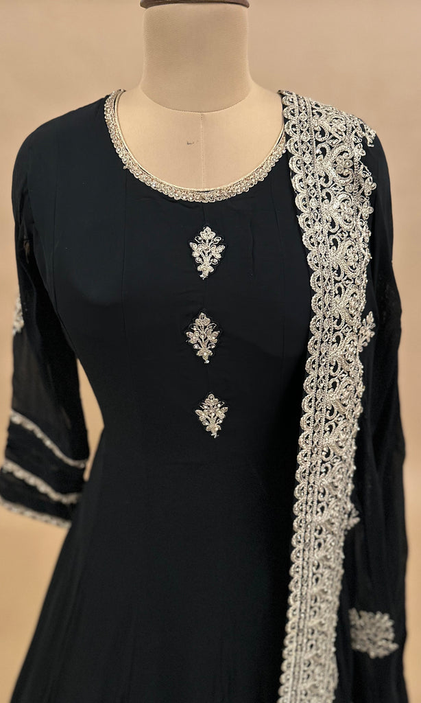 Party Wear Long Dress On Georgette Fabric Black Color With Heavy Dupatta