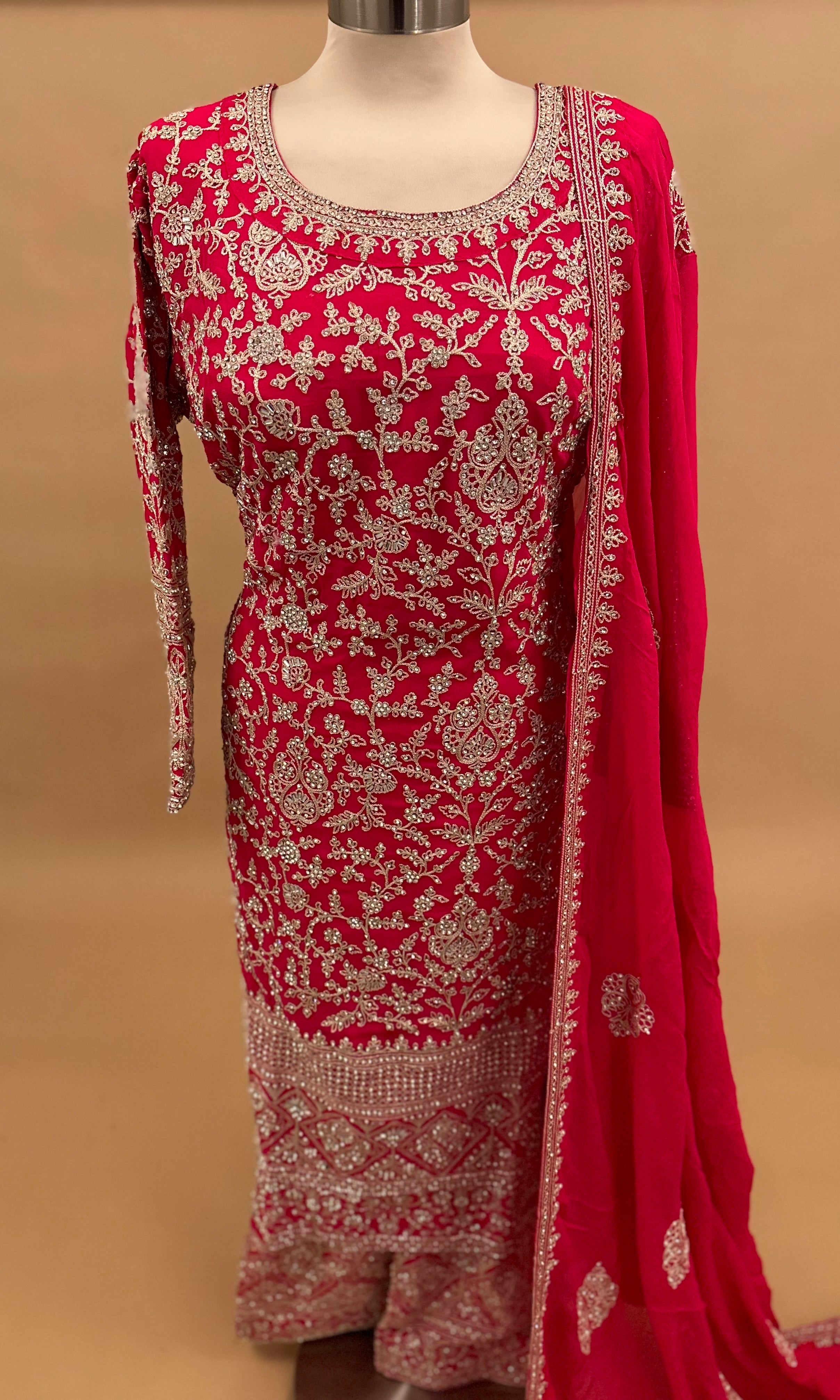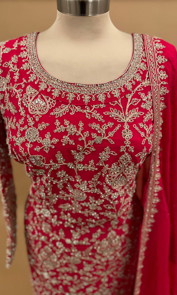 Elevate your festive wardrobe with this long Pinkish Red kameez, richly adorned with intricate stone embroidery. Crafted from elegant Chinon fabric, it offers a graceful drape and comfort ideal for special occasions. The suit includes matching pants and a coordinating dupatta, creating a complete ensemble that blends traditional craftsmanship with contemporary style. Perfect for parties, this outfit promises both sophistication and lasting appeal.