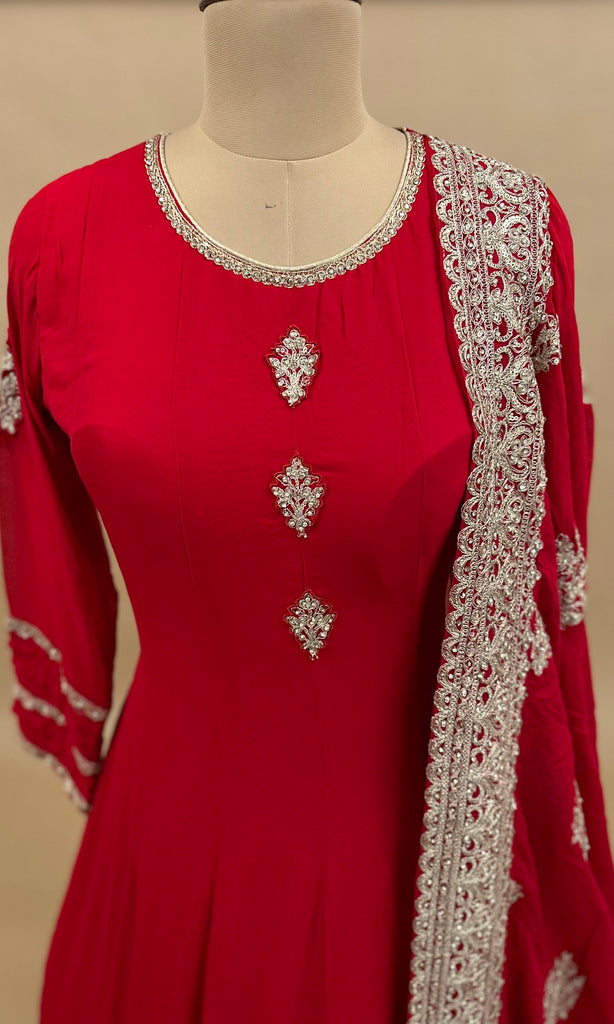 This elegant long party dress in vibrant red is crafted from lightweight georgette fabric, ensuring graceful movement and comfort. It features intricate stone embroidery that adds a refined sparkle, perfect for special occasions. The accompanying heavily embroidered dupatta complements the dress, enhancing its luxurious appeal. Ideal for festive events, this ensemble balances tradition with contemporary style seamlessly.