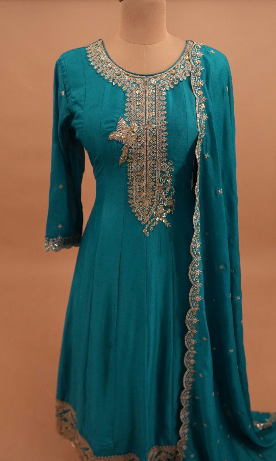 Turquoise Blue Color Premium Silk Fabric Party Wear Long Dress