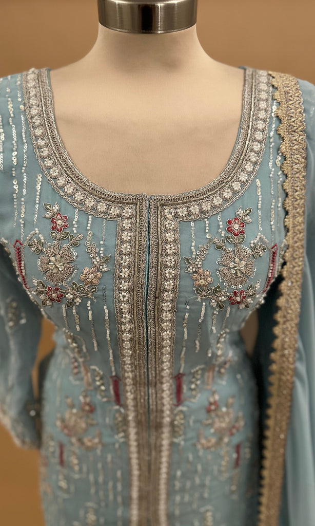 Experience elegance with this lightweight blue palazzo suit, beautifully crafted from soft georgette fabric. The intricate beads embroidery enhances its sophisticated appeal, making it perfect for festive occasions or formal events. Complete with a matching dupatta, this ensemble balances comfort and style effortlessly.