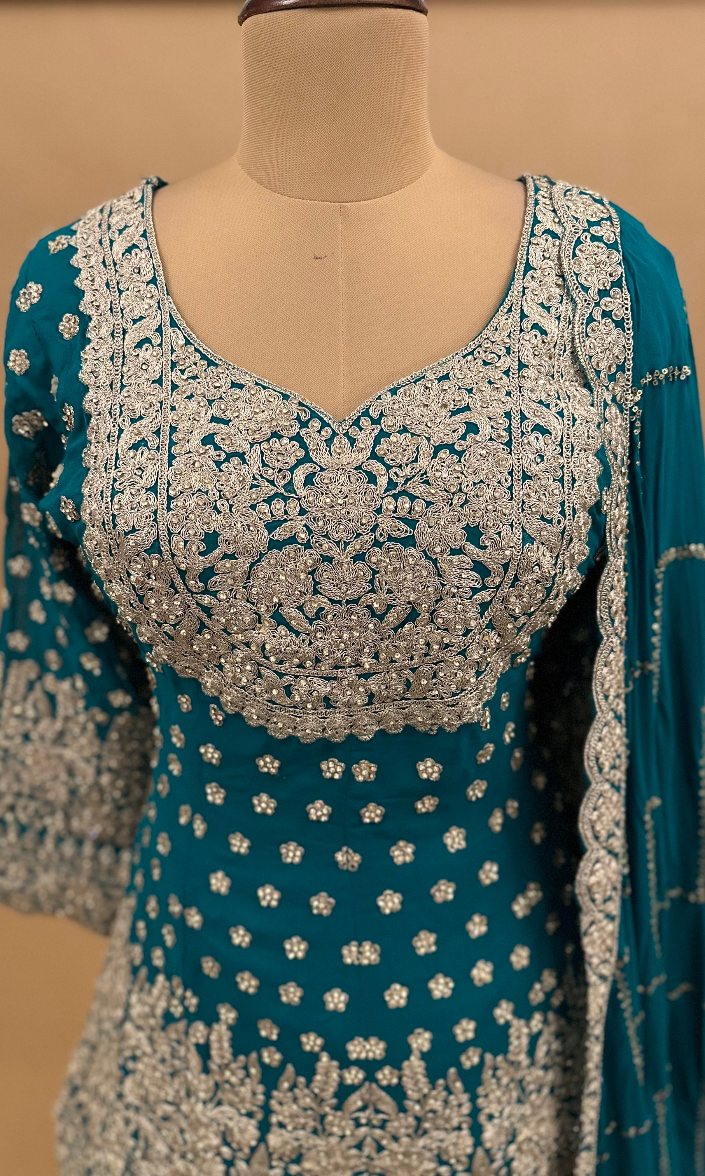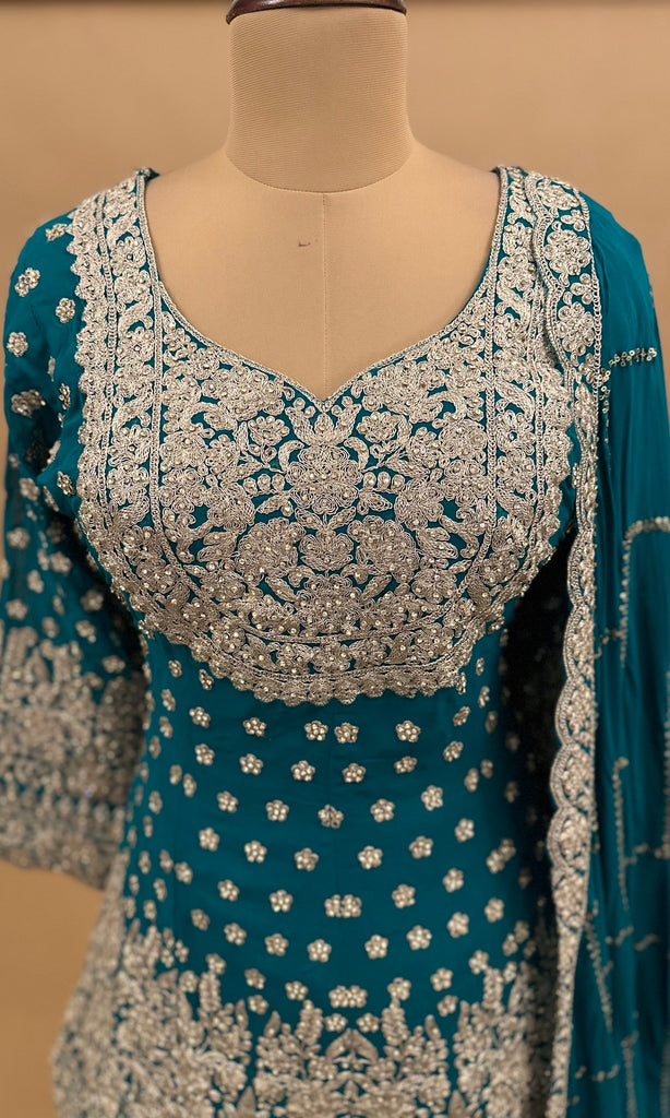 This Blue peplum style outfit features intricate heavy stone embroidery, showcasing expert craftsmanship. Made from lightweight georgette fabric, it offers a graceful drape and comfortable wear. Paired with a matching skirt, this ensemble combines traditional embellishment with a contemporary silhouette for a striking, elegant look. Ideal for special occasions, it delivers both style and sophistication.