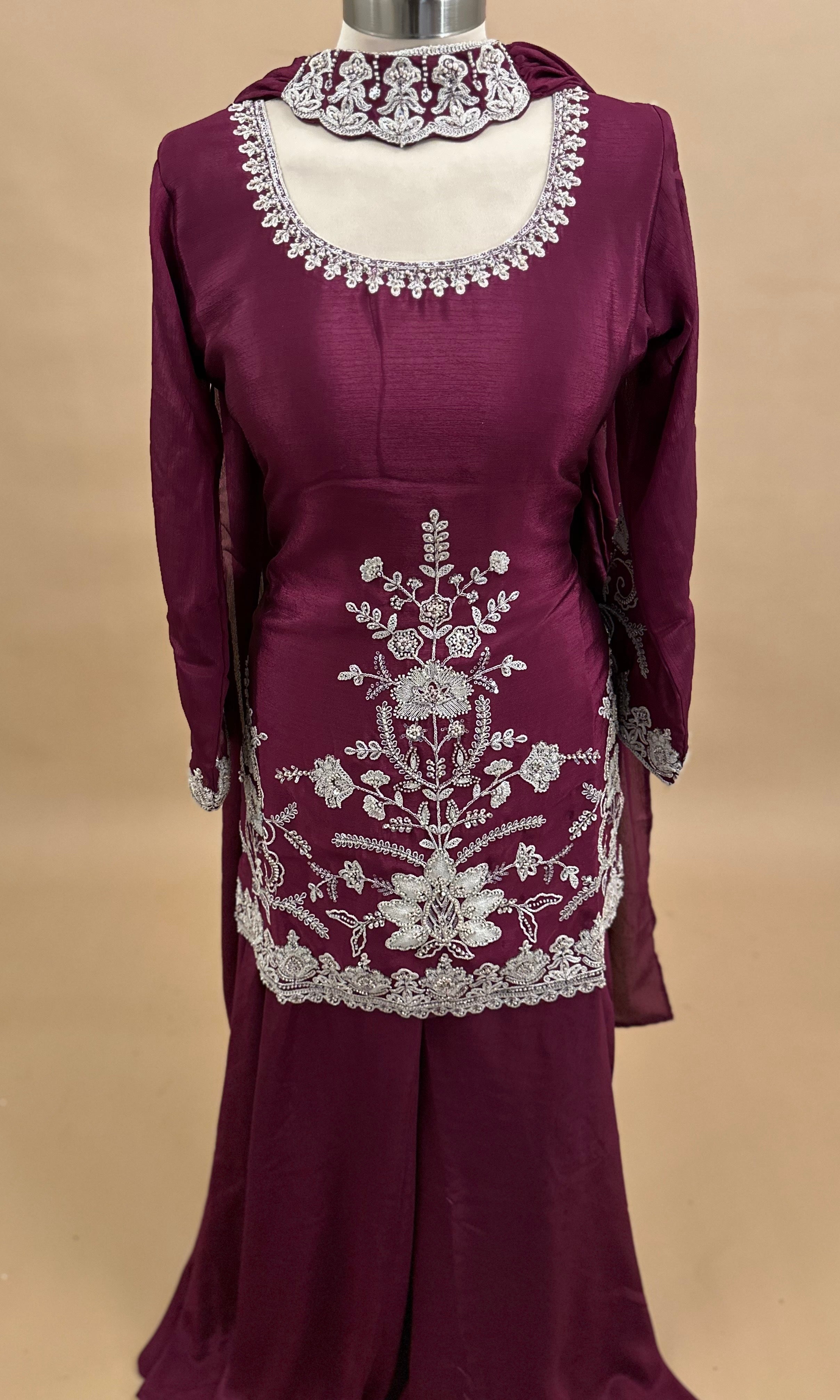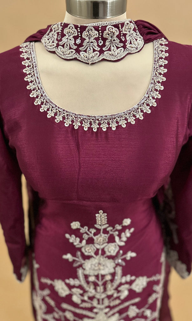 Elevate your party wardrobe with this stunning Blackish Maroon Chinon fabric palazzo suit, expertly crafted for sophisticated occasions. The ensemble features an elegant choker-style dupatta that frames the neckline beautifully, while intricate sequin embroidery adds glamorous dimension throughout. The lightweight Chinon fabric drapes gracefully, ensuring comfort without compromising on style. This coordinated set combines traditional elegance with contemporary design, making it an ideal choice for weddings, celebrations, and formal gatherings. The included dupatta completes the look with versatile styling options.
