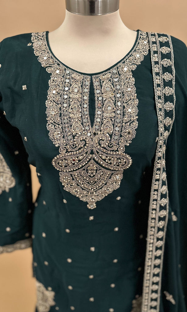 Elevate your festive wardrobe with this Chinon fabric palazzo suit in a sophisticated blackish maroon shade. Featuring intricate stone embroidery, this ensemble blends traditional craftsmanship with contemporary style. The comfortable Chinon fabric ensures a graceful drape and ease of movement, while the matching dupatta completes the elegant look, making it perfect for parties and special occasions.