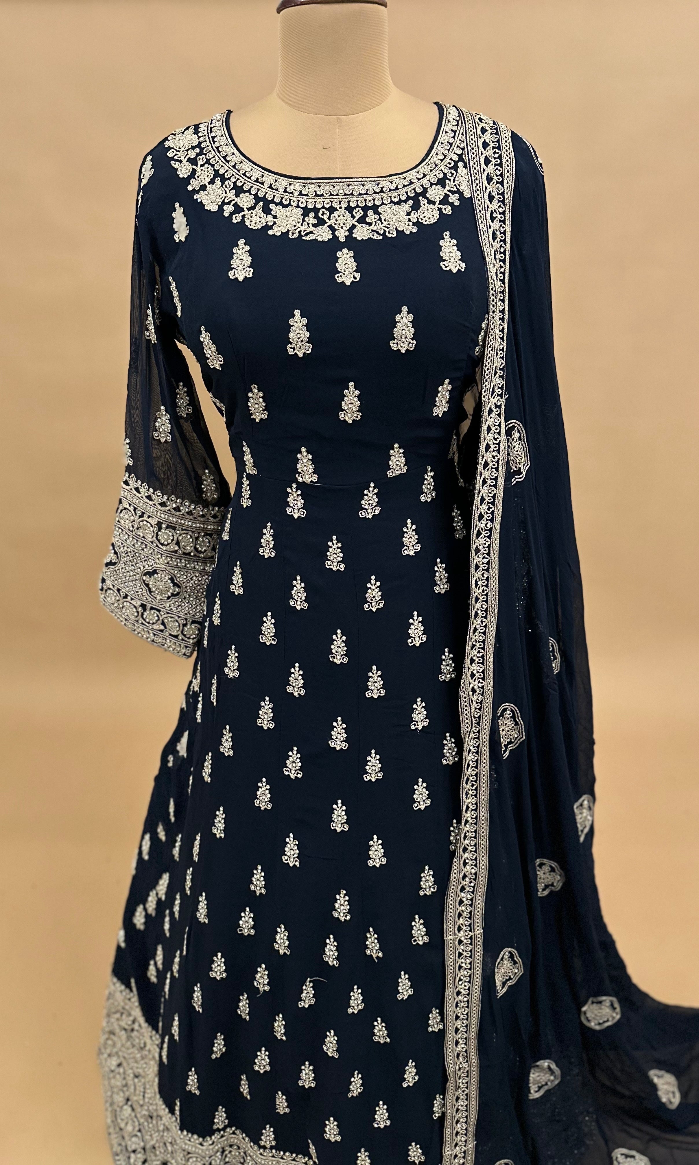 This elegant long dress in dark navy blue features intricate heavy stone embroidery that adds a luxurious touch. Crafted from lightweight georgette fabric, it offers a graceful drape and comfortable fit. The matching dupatta complements the detailed work, making this ensemble perfect for formal occasions where sophistication and style are essential.