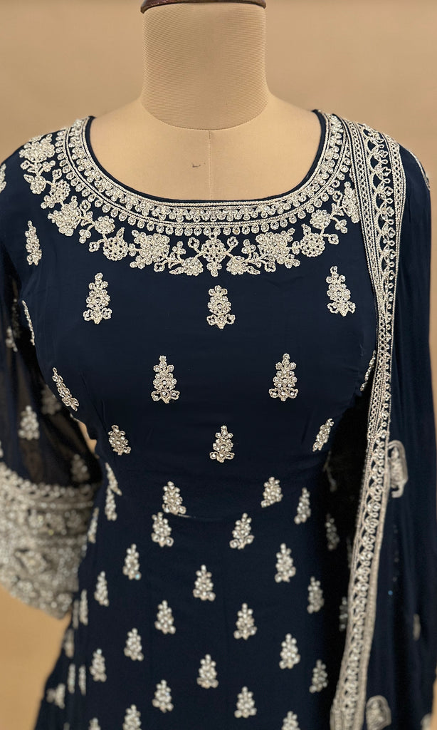 Dark Navy Blue Color Heavy Stone Work Embroiderey Long Dress With Dupatta