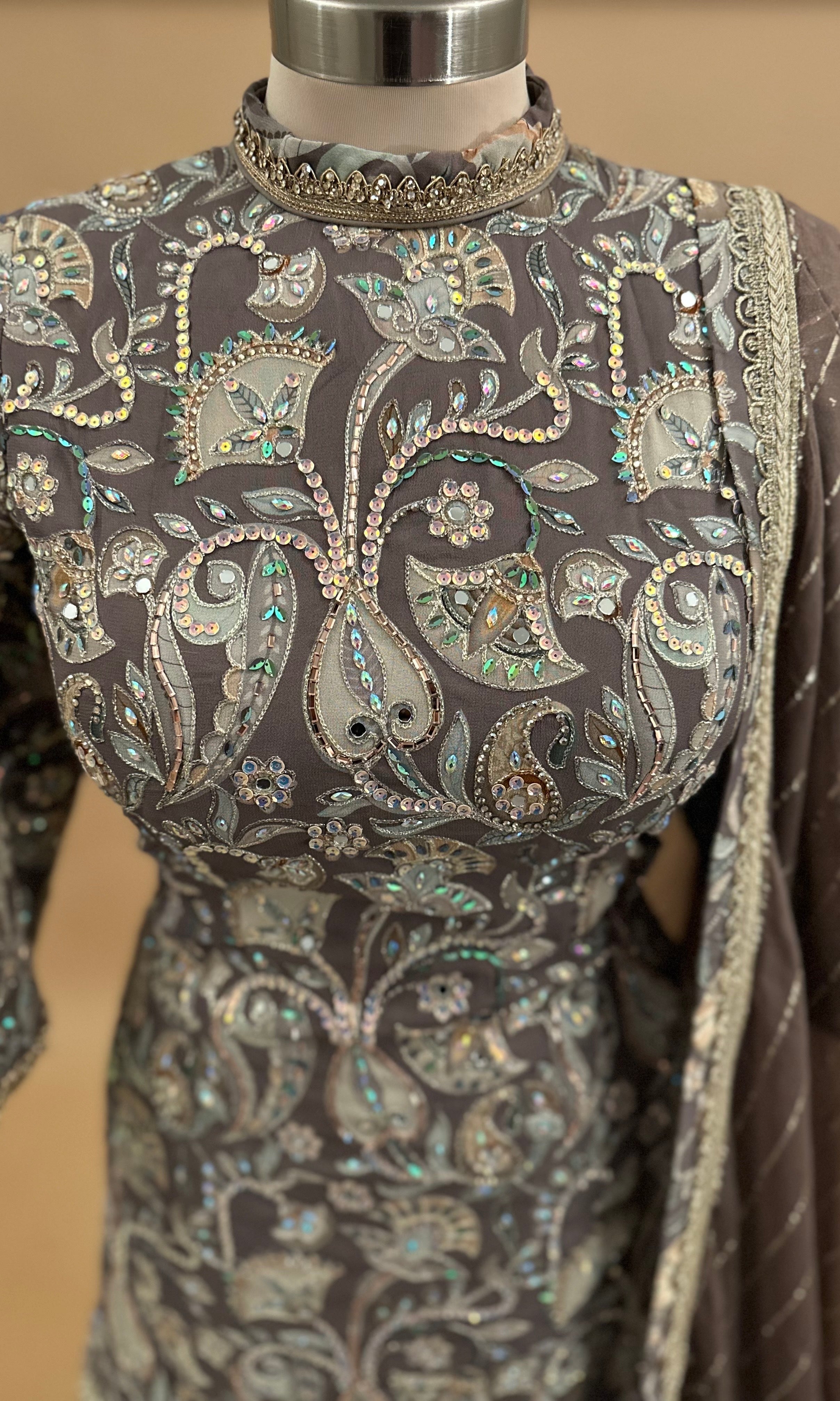Elevate your festive wardrobe with this stunning Mouse sharara suit, crafted from premium dasheen fabric that drapes beautifully and offers exceptional comfort. The ensemble features intricate stone and sequin embroidery work that catches light elegantly, making it perfect for weddings, celebrations, and special occasions. The coordinating dupatta completes the sophisticated look with traditional charm. This party wear piece combines timeless design with quality craftsmanship, ensuring you stand out with grace and style.