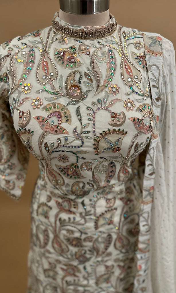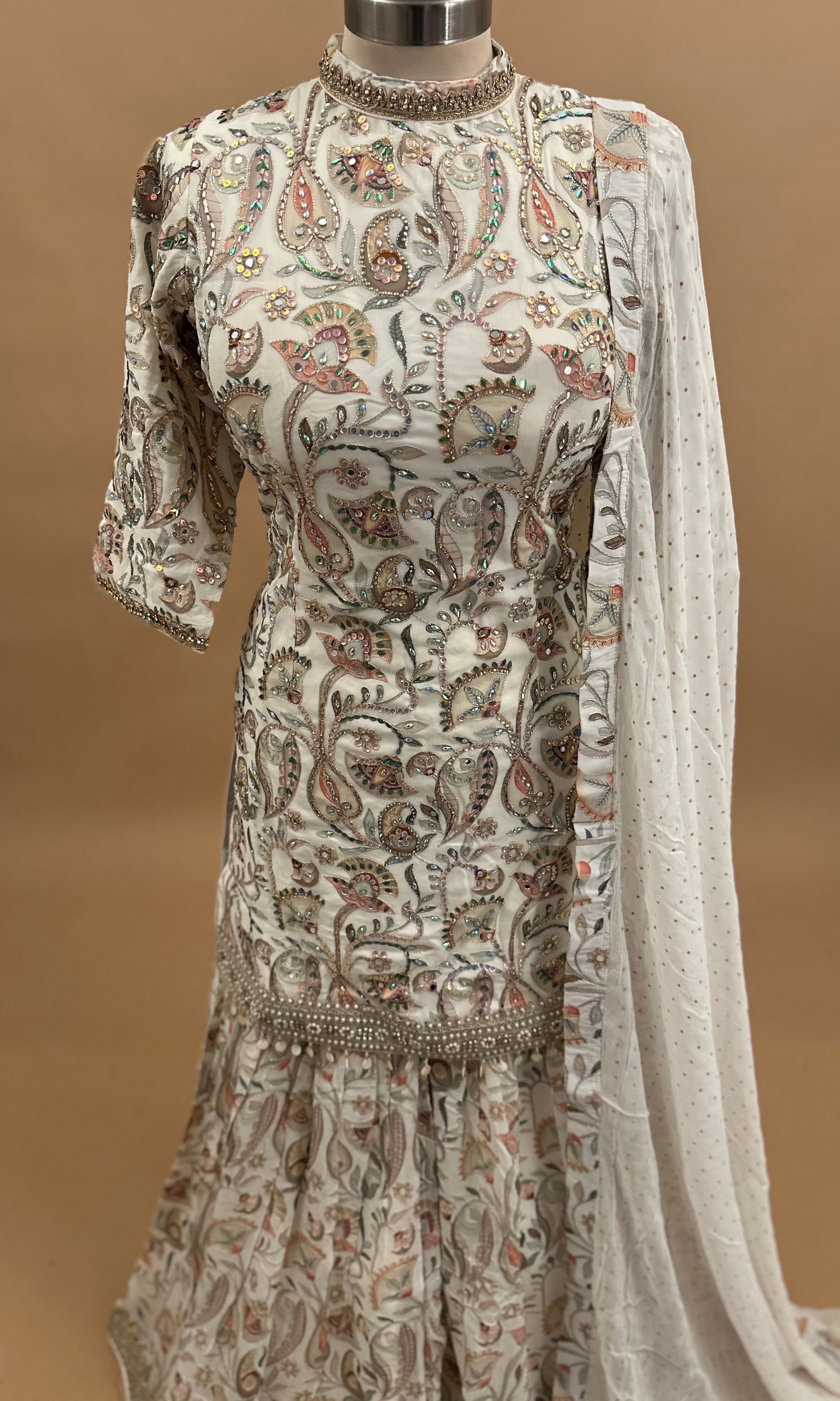 Elevate your festive wardrobe with this stunning Off White sharara suit, crafted from premium dasheen fabric that drapes beautifully and offers exceptional comfort. The ensemble features intricate stone and sequin embroidery work that catches light elegantly, making it perfect for weddings, celebrations, and special occasions. The coordinating dupatta completes the sophisticated look with traditional charm. This party wear piece combines timeless design with quality craftsmanship, ensuring you stand out with grace and style.