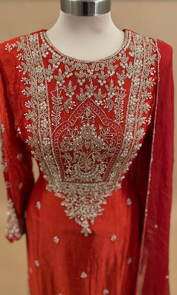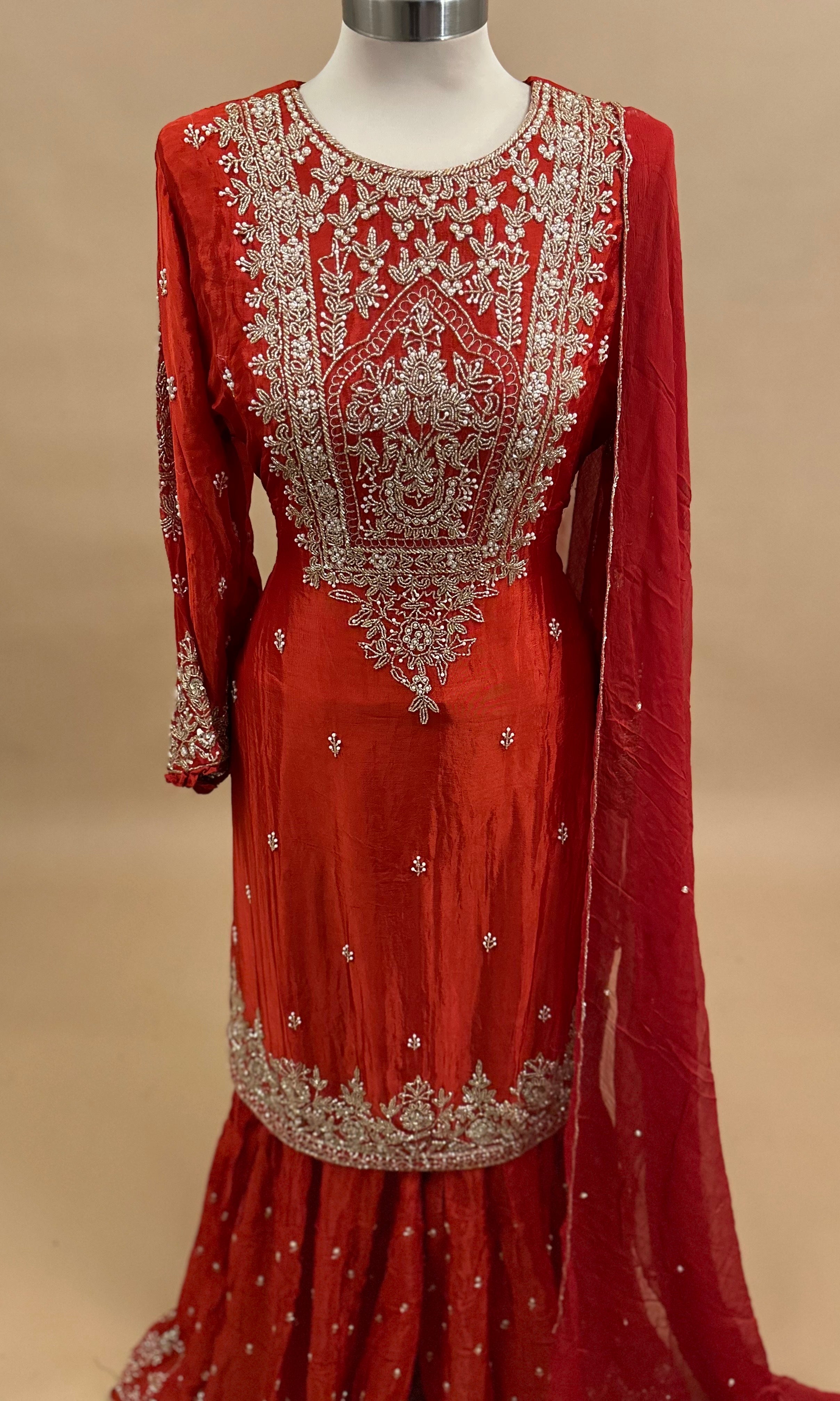 Elevate your party wardrobe with this stunning Dark Orange sharara suit, crafted from luxurious Dasheen fabric that drapes beautifully. The ensemble features intricate beads and stone embroidery work that adds sophisticated glamour to the elegant silhouette. The coordinating dupatta completes the refined look, making it an ideal choice for weddings, celebrations, and formal gatherings. Perfect for those seeking timeless style with contemporary flair.