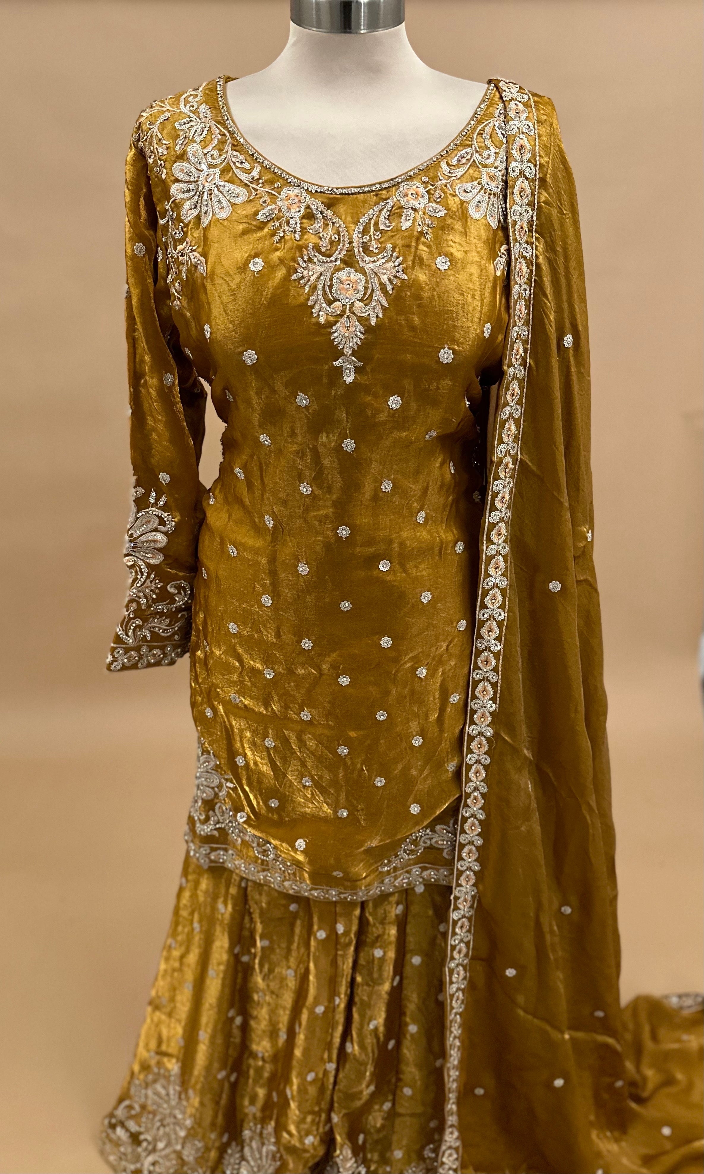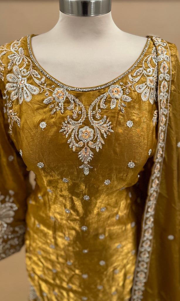 This gold party wear palazzo suit is crafted from premium shimmer silk fabric, featuring detailed stone work embroidery that adds a touch of refined glamour. Designed for occasions where elegance matters, the suit offers a blend of comfort and style, ensuring you make a memorable impression. The soft texture of the shimmer silk enhances the overall luxurious feel, making it an excellent choice for festive events.