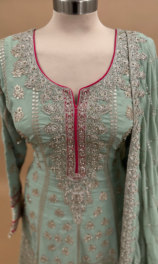 This Green palazzo suit is crafted from flowing georgette fabric, offering a graceful and comfortable wear. It features heavy stone embroidery that adds luxurious texture and visual appeal. Paired with a matching dupatta, this ensemble is ideal for formal occasions where elegance and intricate detailing are paramount.