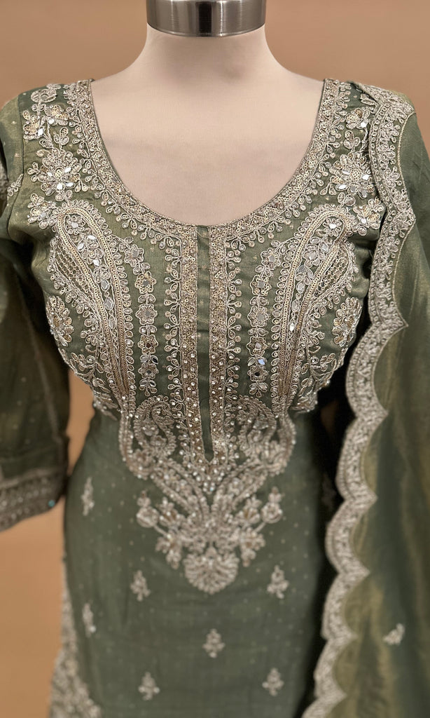 This Green Party Wear Palazzo Suit is crafted from lightweight shimmer fabric, offering a graceful and comfortable fit. Detailed with exquisite mirror and stone work embroidery, it adds a subtle yet captivating sparkle. The matching dupatta completes this elegant ensemble, perfect for festive occasions and special gatherings.