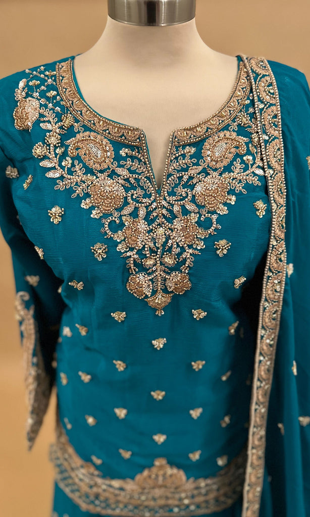 Elevate your festive wardrobe with this Blue palazzo suit crafted from soft Chinon fabric. Featuring exquisite hand-embroidered beadwork, this party wear set combines traditional artistry with contemporary style. The accompanying dupatta completes the look, making it perfect for celebrations and special occasions where elegance and comfort are essential.