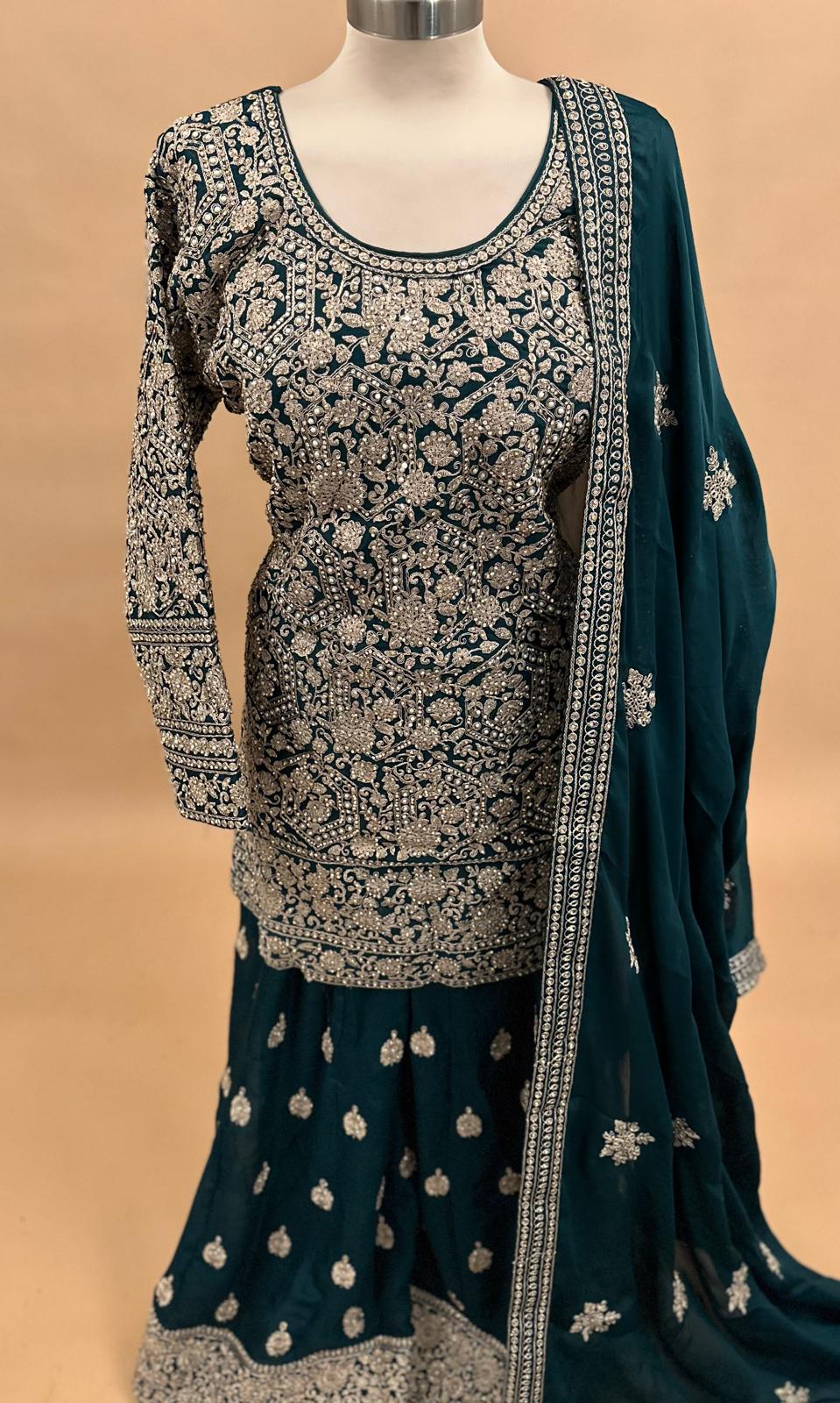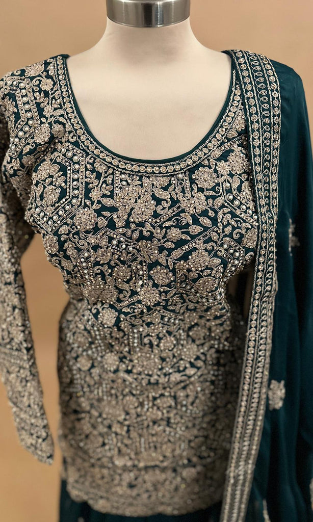 Elevate your festive wardrobe with this dark green satin silk palazzo suit, intricately embroidered with heavy stone and pearl work. The exquisite craftsmanship adds a luxurious sheen and texture, perfect for special occasions and evening parties. Included is a matching dupatta that complements the suit’s elegant appeal, making it a standout ensemble for sophisticated celebrations.