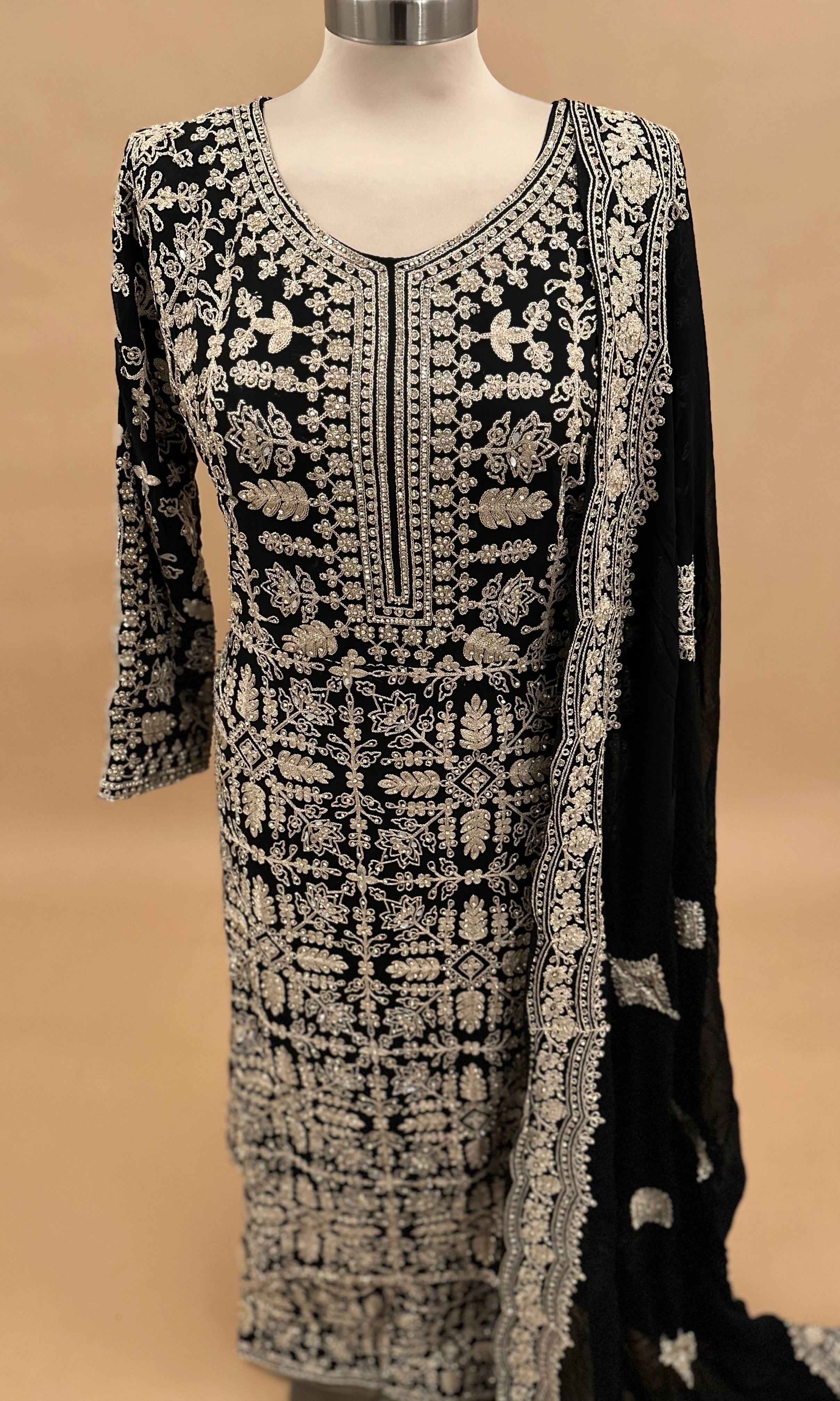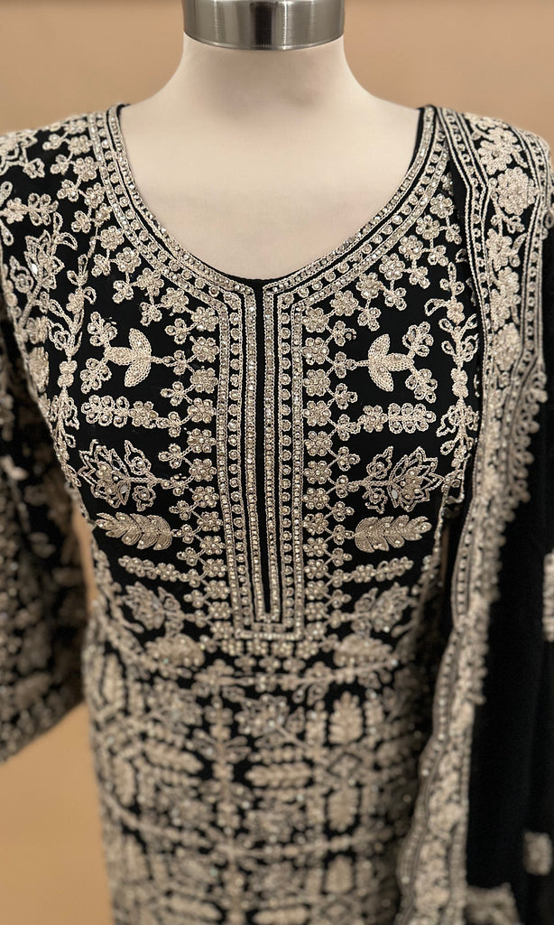 This elegant long black kameez suit features intricate heavy stone embroidery that enhances its rich georgette fabric. Designed for sophistication and comfort, it pairs seamlessly with coordinating pants, making it ideal for formal occasions or festive gatherings. The detailed stone work adds a luxurious touch, ensuring a standout look with every wear.