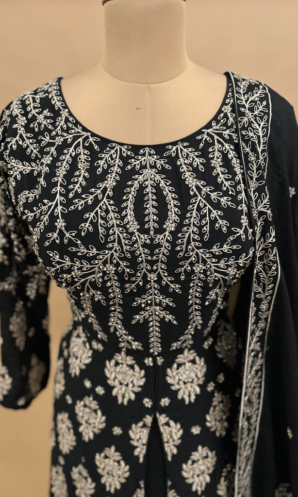 This Indo-western dress in black features intricate heavy stone work embroidery, adding a luxurious and eye-catching sparkle ideal for party occasions. Crafted from soft Chinon fabric, it offers a comfortable yet elegant fit that complements its detailed embellishments. Perfect for those seeking a blend of traditional artistry and modern style in a sophisticated garment.