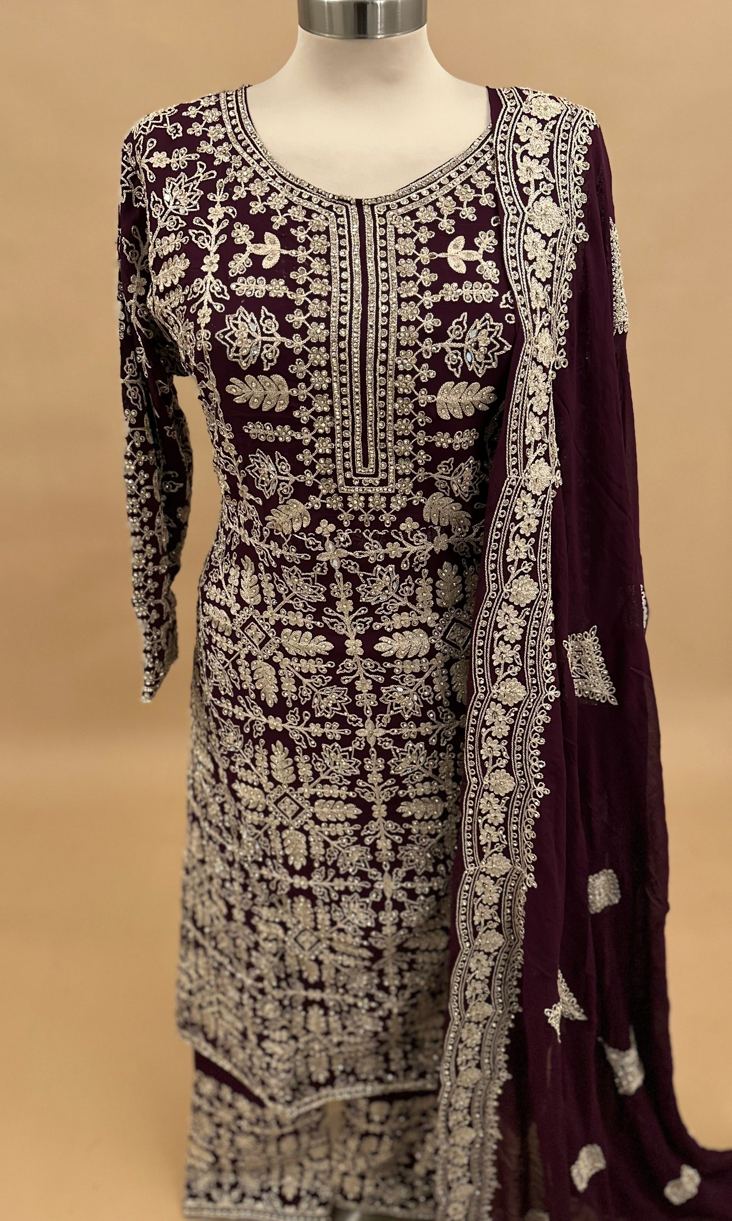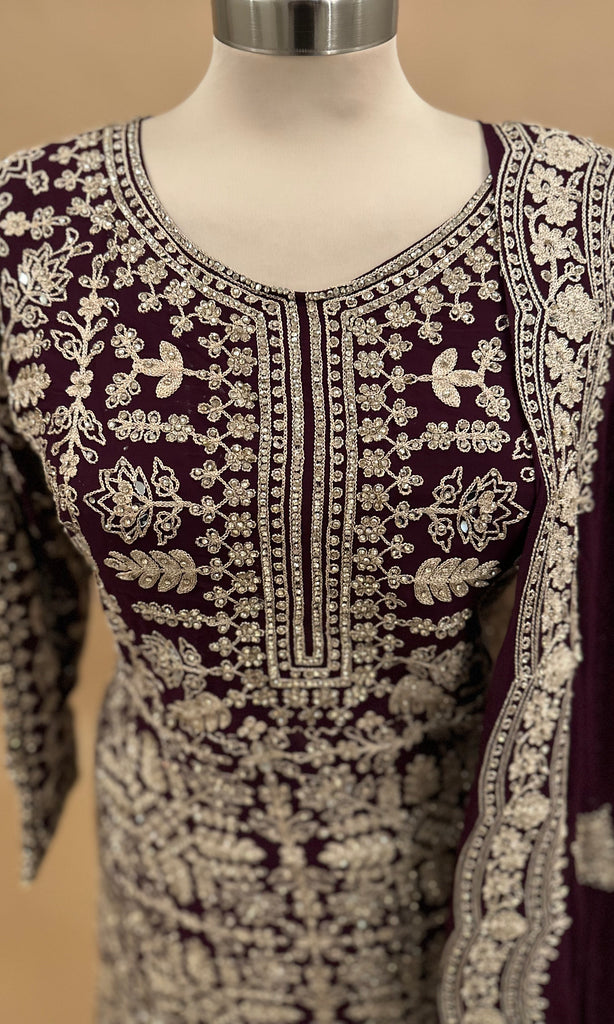 This elegant long Blackish Maroon kameez suit features intricate heavy stone embroidery that enhances its rich georgette fabric. Designed for sophistication and comfort, it pairs seamlessly with coordinating pants, making it ideal for formal occasions or festive gatherings. The detailed stone work adds a luxurious touch, ensuring a standout look with every wear.