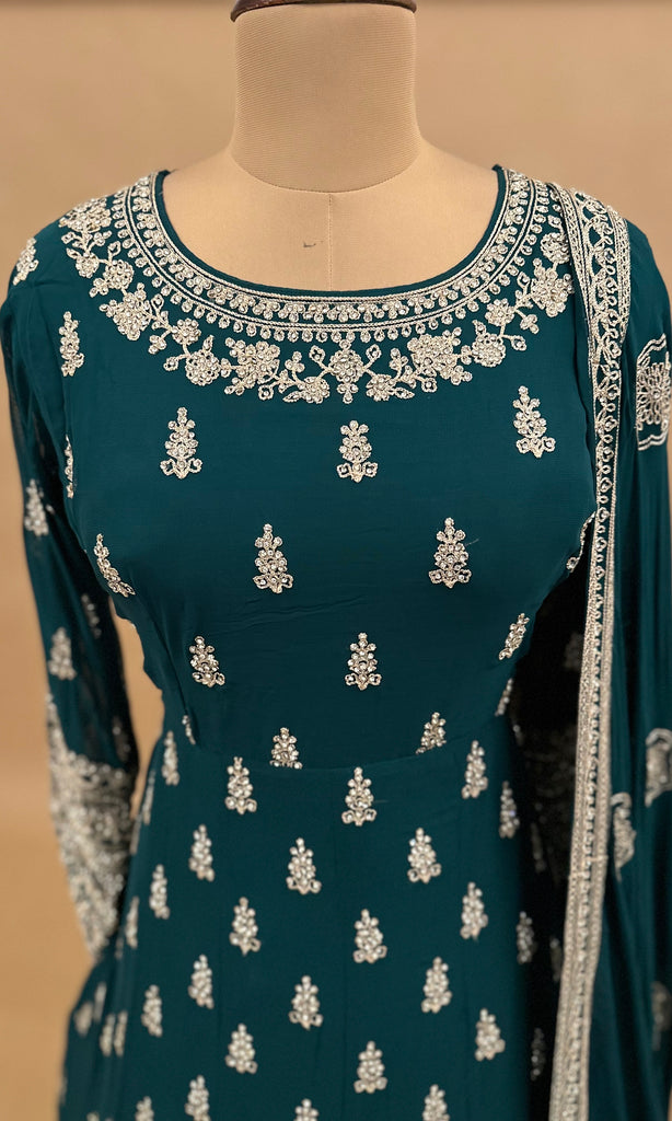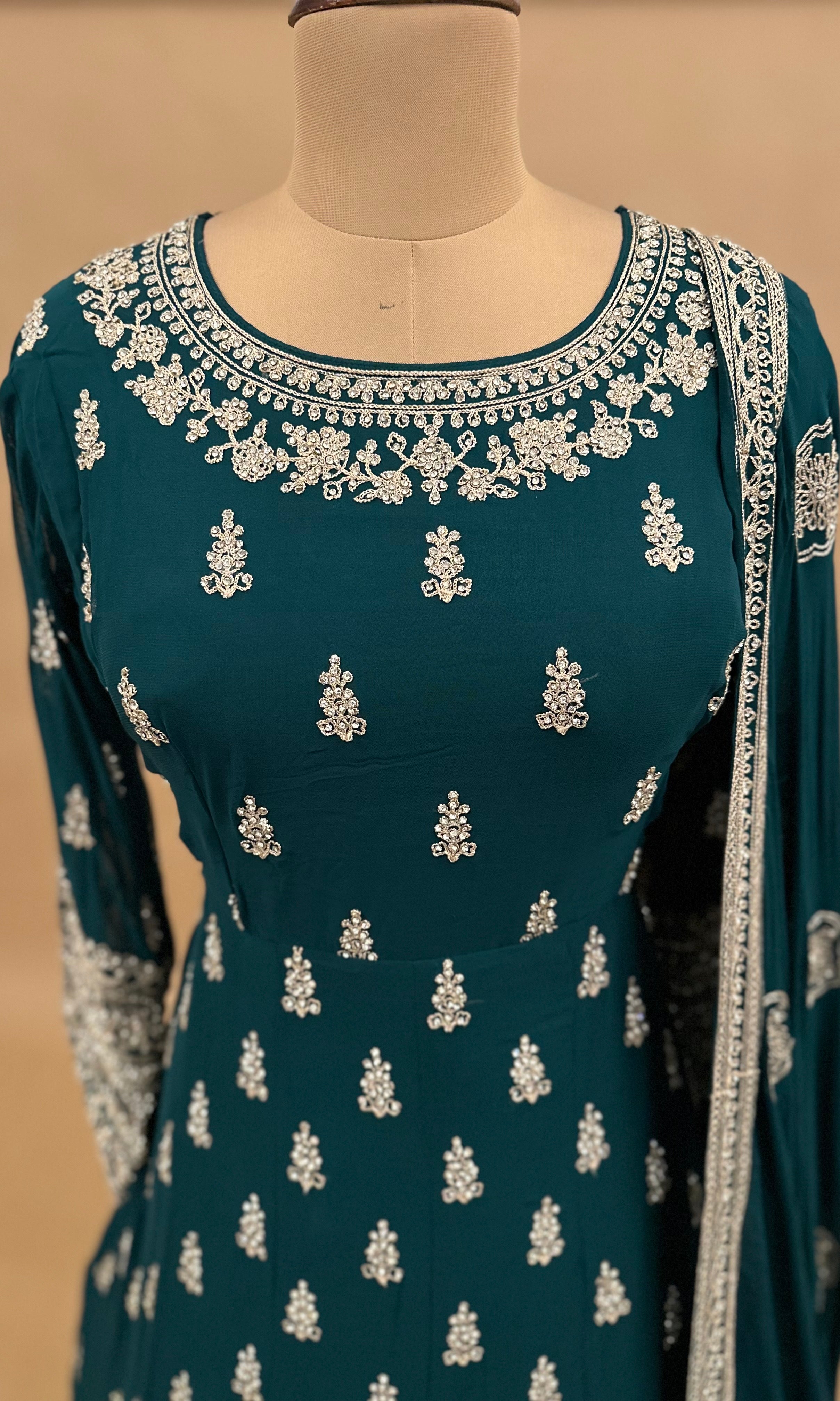 This elegant long dress in Green features intricate heavy stone embroidery that adds a luxurious touch. Crafted from lightweight georgette fabric, it offers a graceful drape and comfortable fit. The matching dupatta complements the detailed work, making this ensemble perfect for formal occasions where sophistication and style are essential.