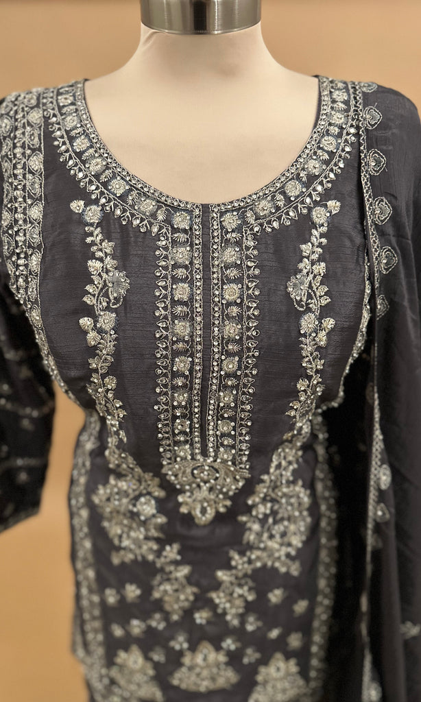 This lightweight grey party wear sharara suit features intricate stone embroidery that adds elegant sparkle. Crafted from soft chinon fabric, it offers comfort and a graceful drape for festive occasions. The matching dupatta completes the ensemble, making it a refined choice for special events.