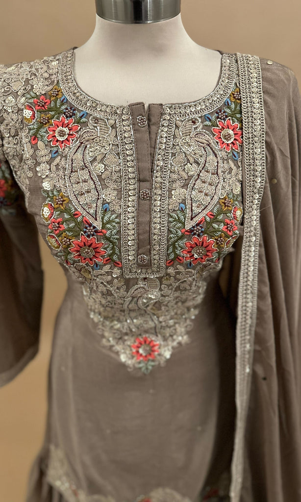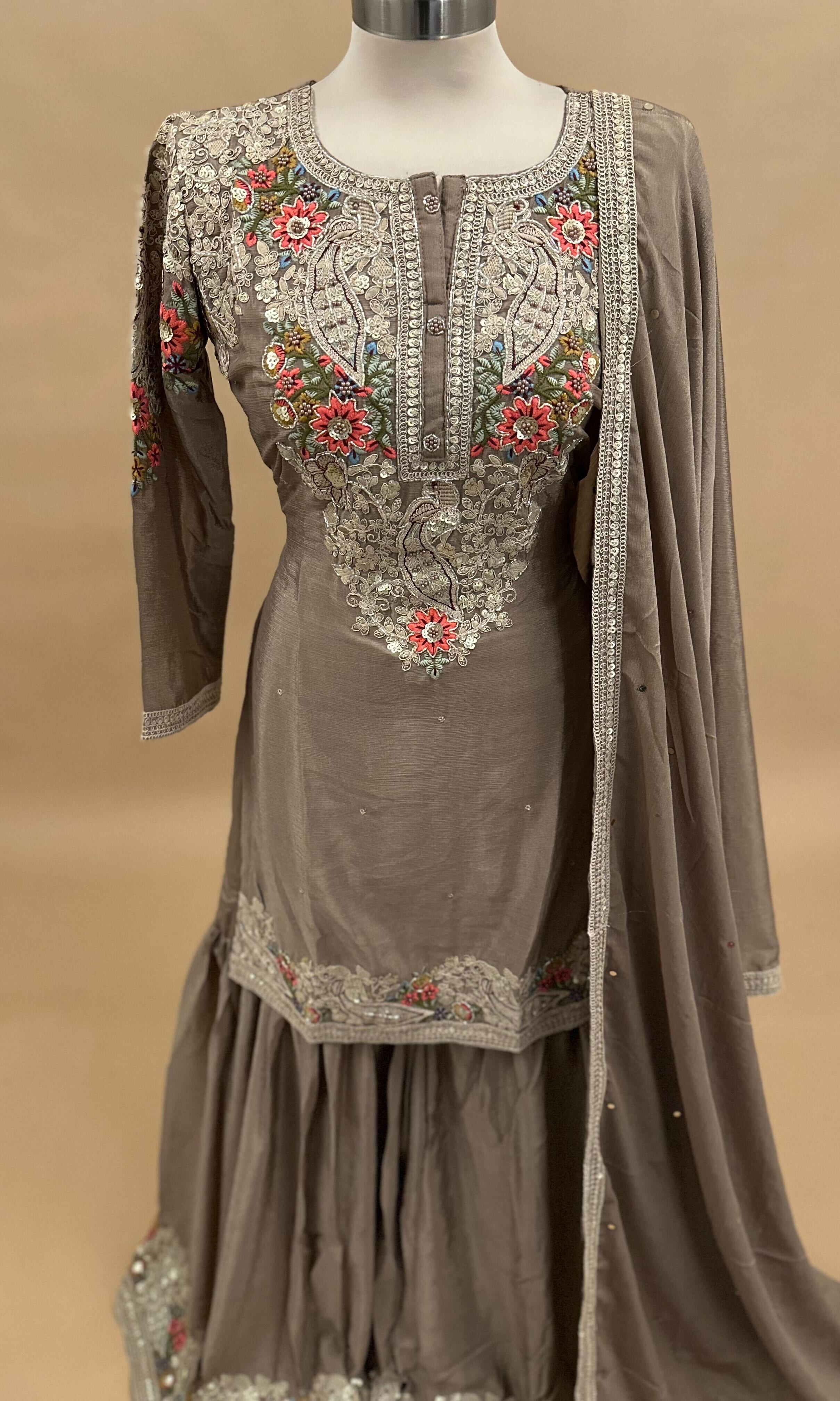 Light Weight Mouse Color Party Wear Sharara Suit With Dupatta