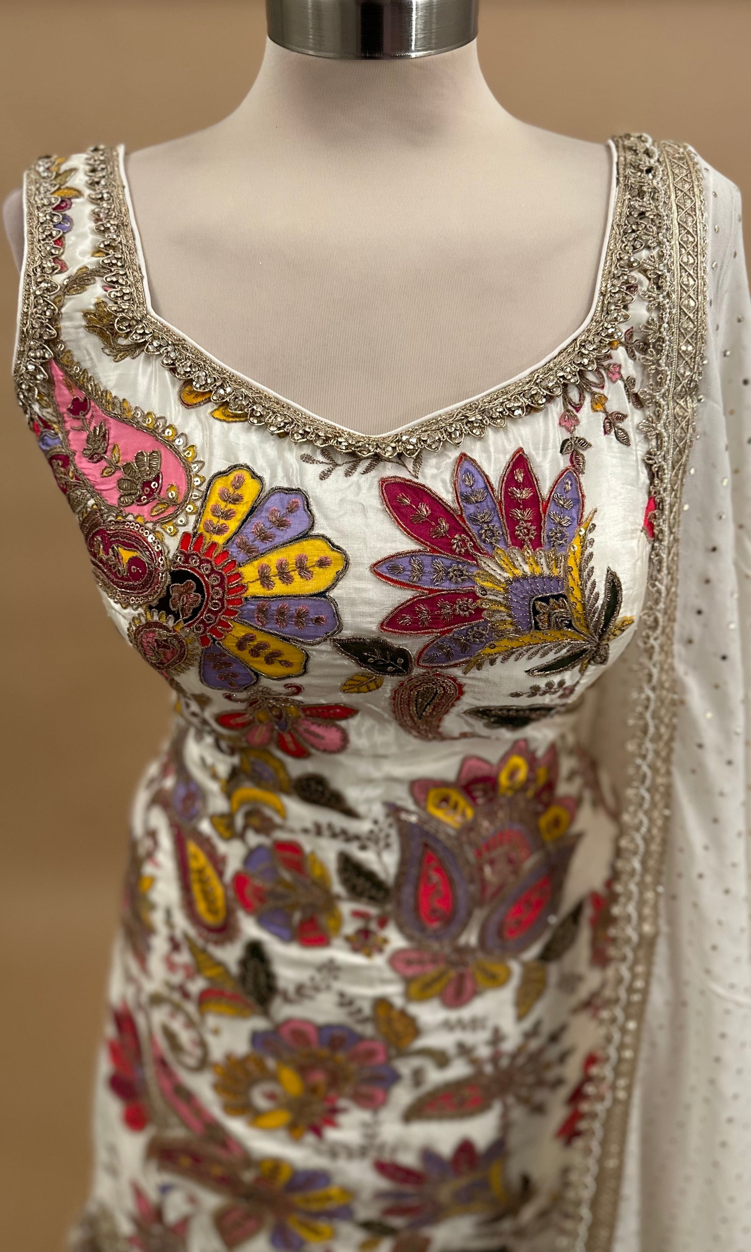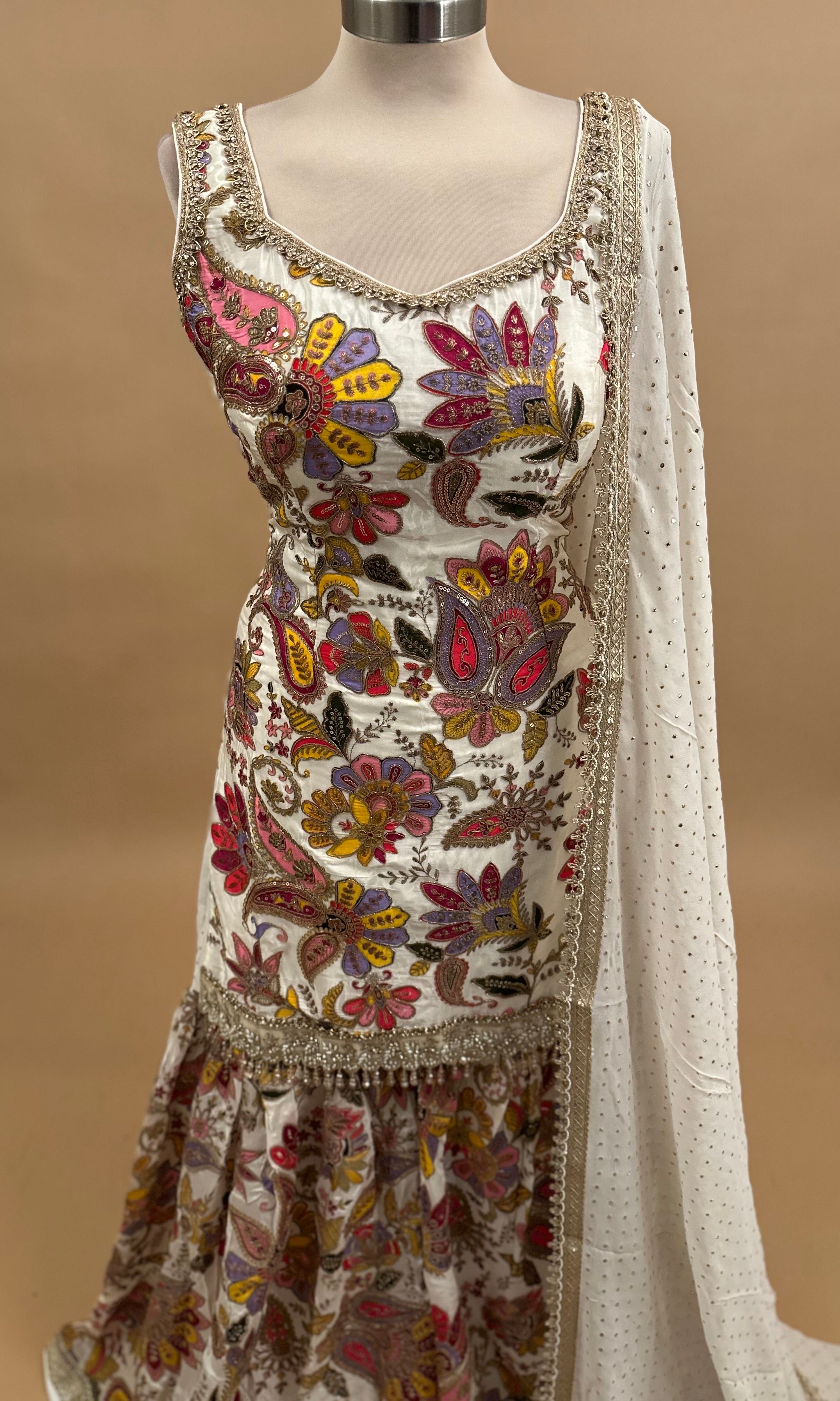 Off White Multicolor Dasheen Fabric Party Wear Sharara Suit With Dupatta