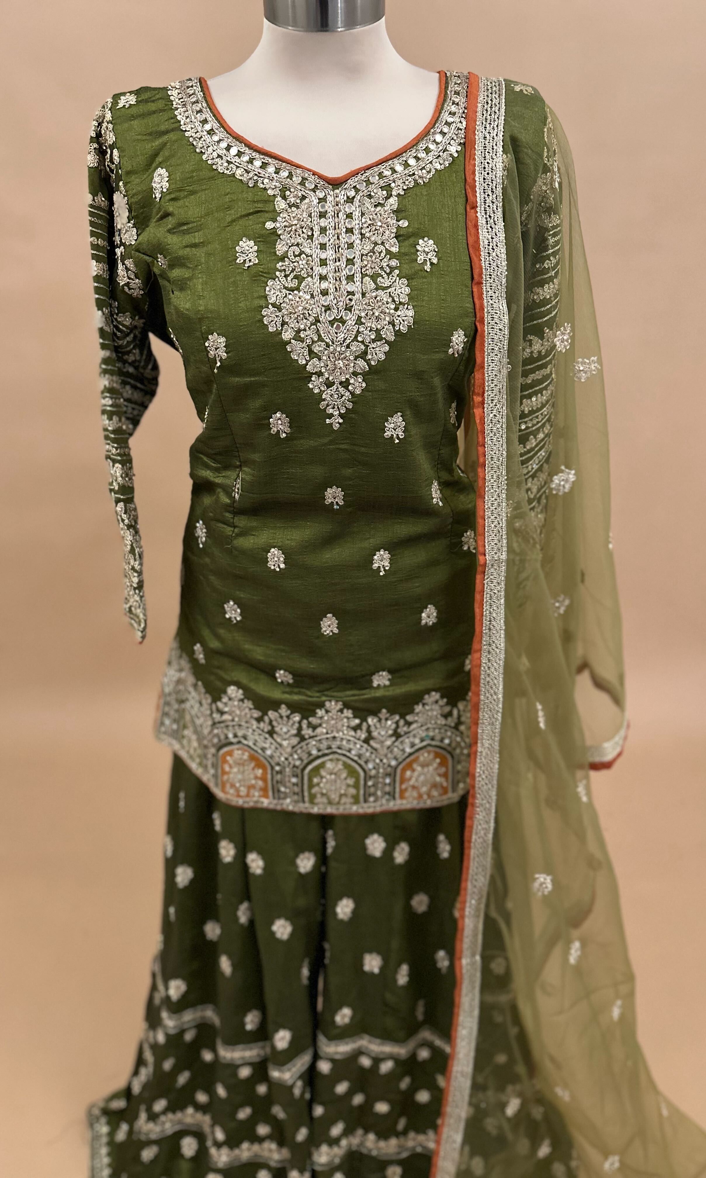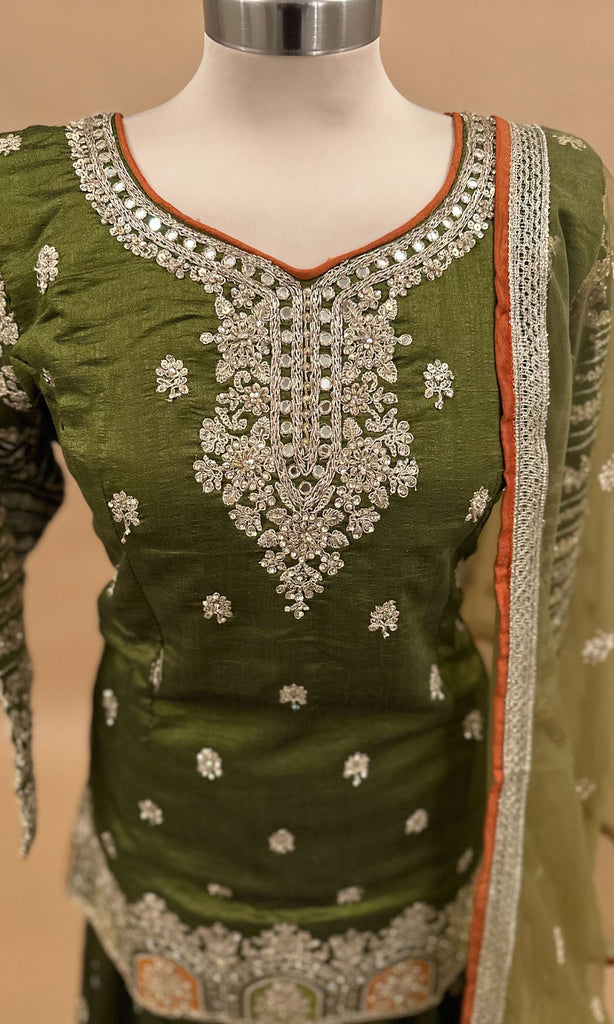 This lightweight palazzo suit features vibrant Green Chinon fabric, offering both comfort and style for warm weather. Detailed with exquisite stone embroidery, it adds a refined elegance to the overall look. The matching dupatta complements the ensemble, making it ideal for festive or casual occasions where subtle sophistication is desired.
